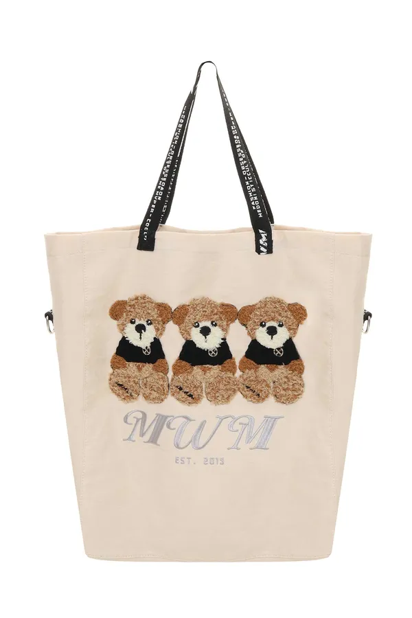 СУМКА-ШОПЕР МОЛОЧНАЯ, БОЛЬШАЯ, КРУПНАЯ СЕРАЯ ЛОГО-НАДПИСЬ, КОРИЧНЕВАЯ НАШИВКА МИШКИ, ЧЁРНЫЕ РУЧКИ И ШИРОКИЙ РЕМЕНЬ В ЛОГО