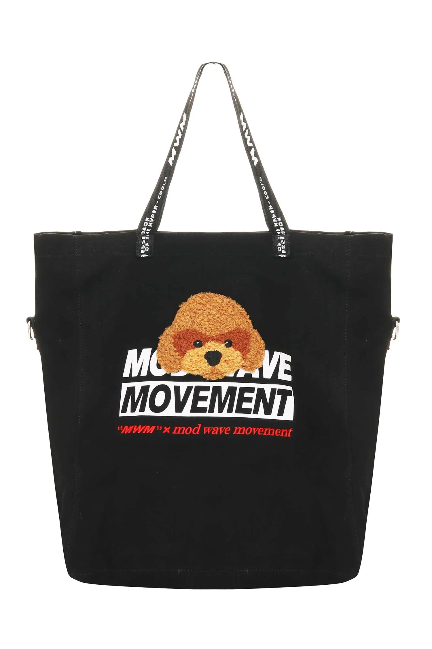 СУМКА-ШОПЕР ЧЁРНАЯ, БОЛЬШАЯ, КРУПНАЯ БЕЛАЯ ЛОГО-НАДПИСЬ, КОРИЧНЕВАЯ НАШИВКА СОБАКА, РУЧКИ И ШИРОКИЙ РЕМЕНЬ В ЛОГО