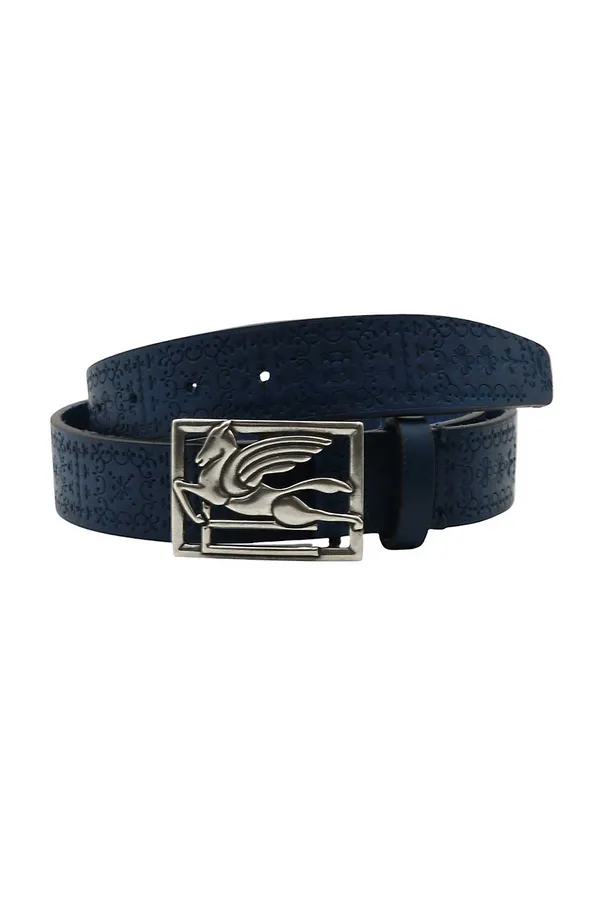 ETRO РЕМЕНЬ СИНИЙ, ТИСНЁНАЯ КОЖА, СЕРЕБРИСТАЯ ПРЯЖКА PEGASO, Ш=3,5