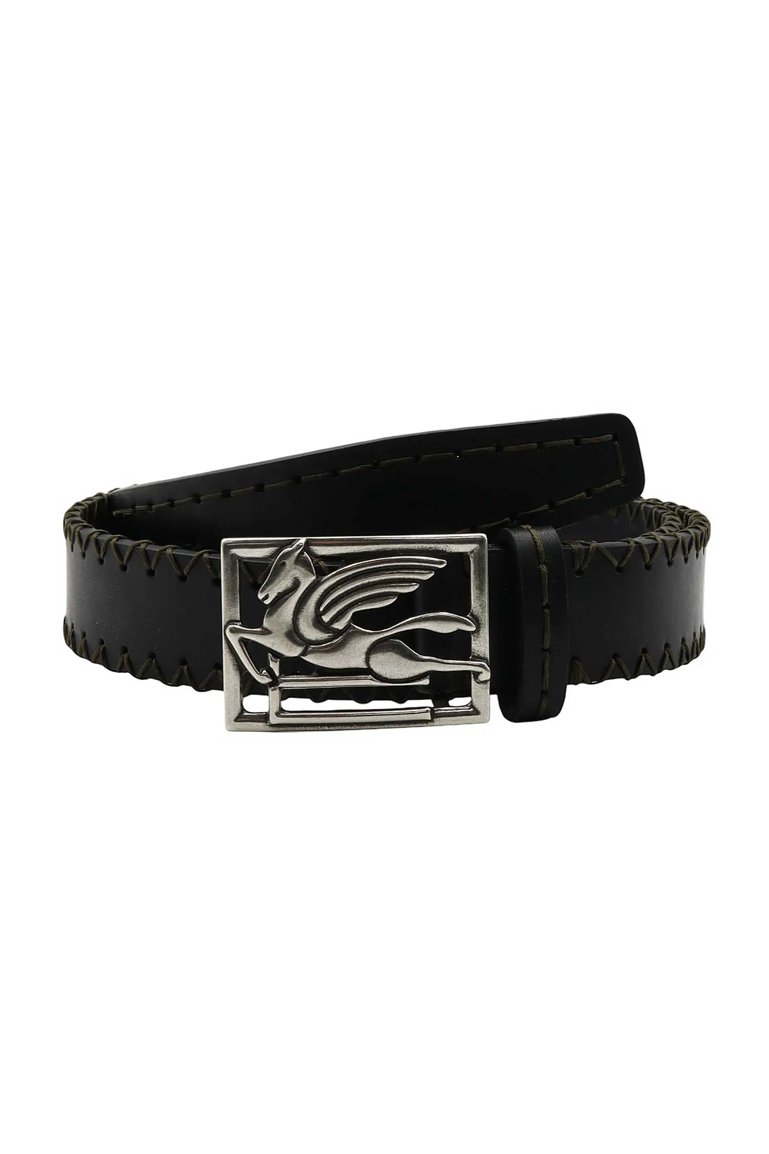 ETRO РЕМЕНЬ ЧЁРНЫЙ С ОЛИВКОВОЙ ОКАНТОВКОЙ ИЗ НИТЕЙ, МАТОВАЯ КОЖА, СЕРЕБРИСТАЯ ПРЯЖКА PEGASO, Ш=3,5