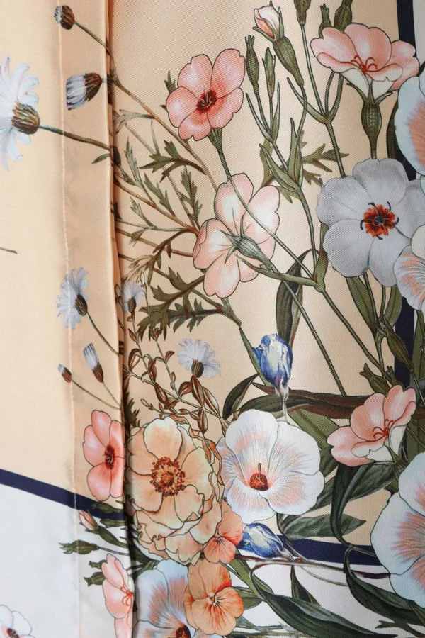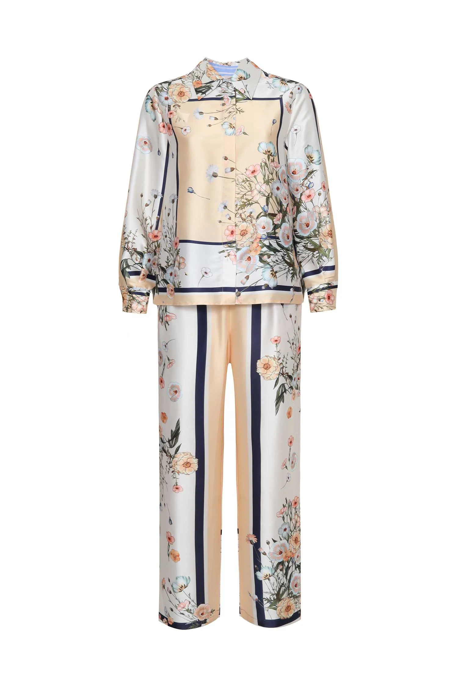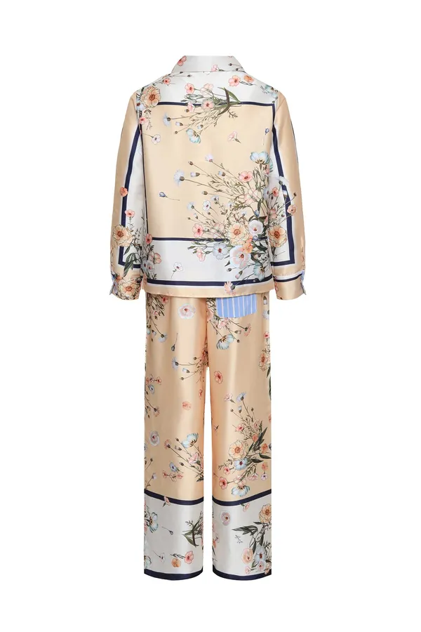 LIU-JO КОСТЮМ МОЛОЧНО-БЕЖЕВЫЙ ИЗ АТЛАСА, ГРАФИЧНЫЙ ПРИНТ И ЦВЕТЫ, РУБАШКА+ШТАНЫ СВОБОДНЫЕ НА КУЛИСКЕ, ДЛ/РУК.