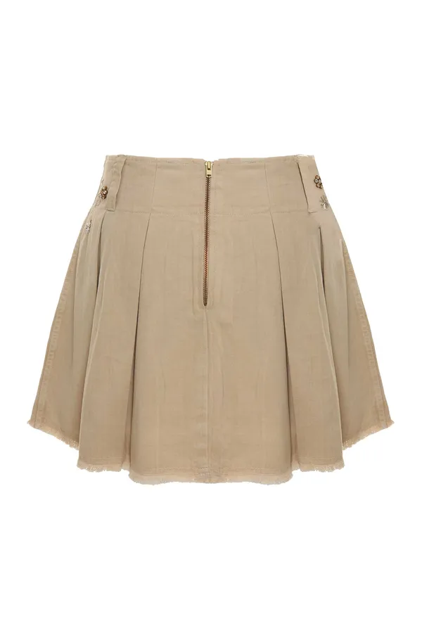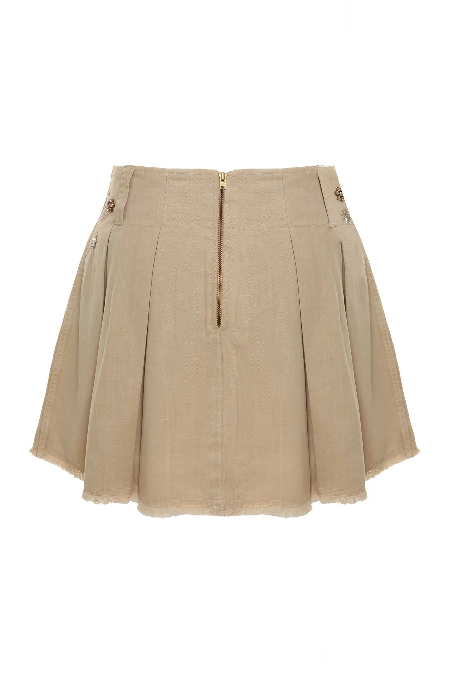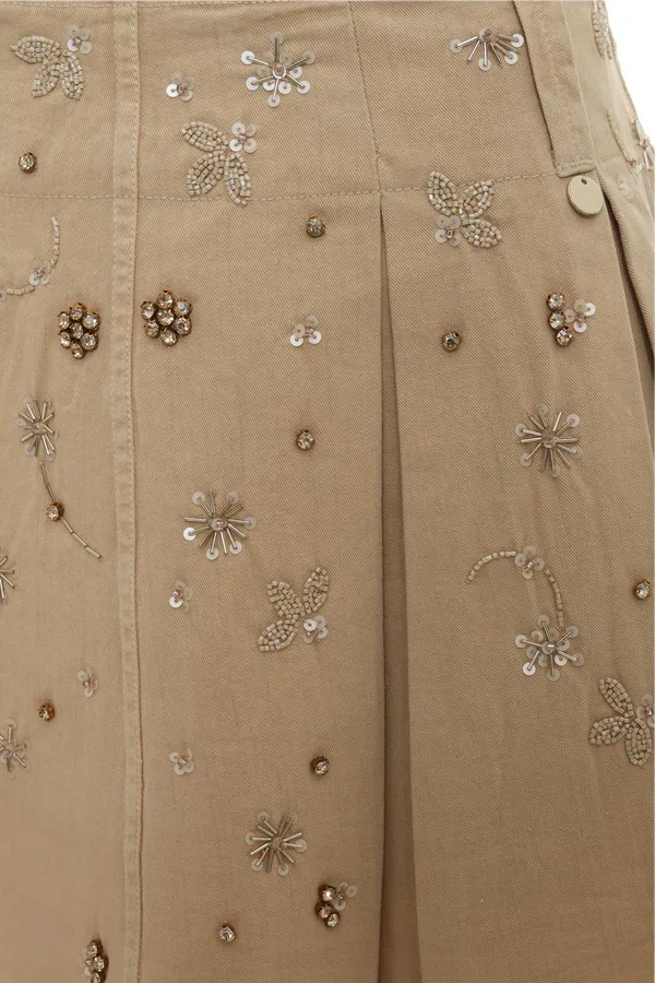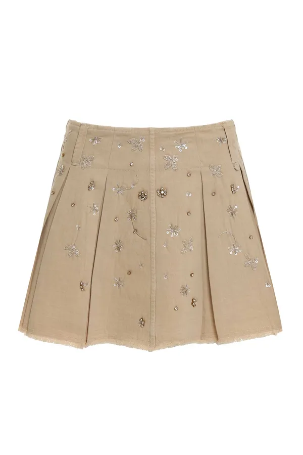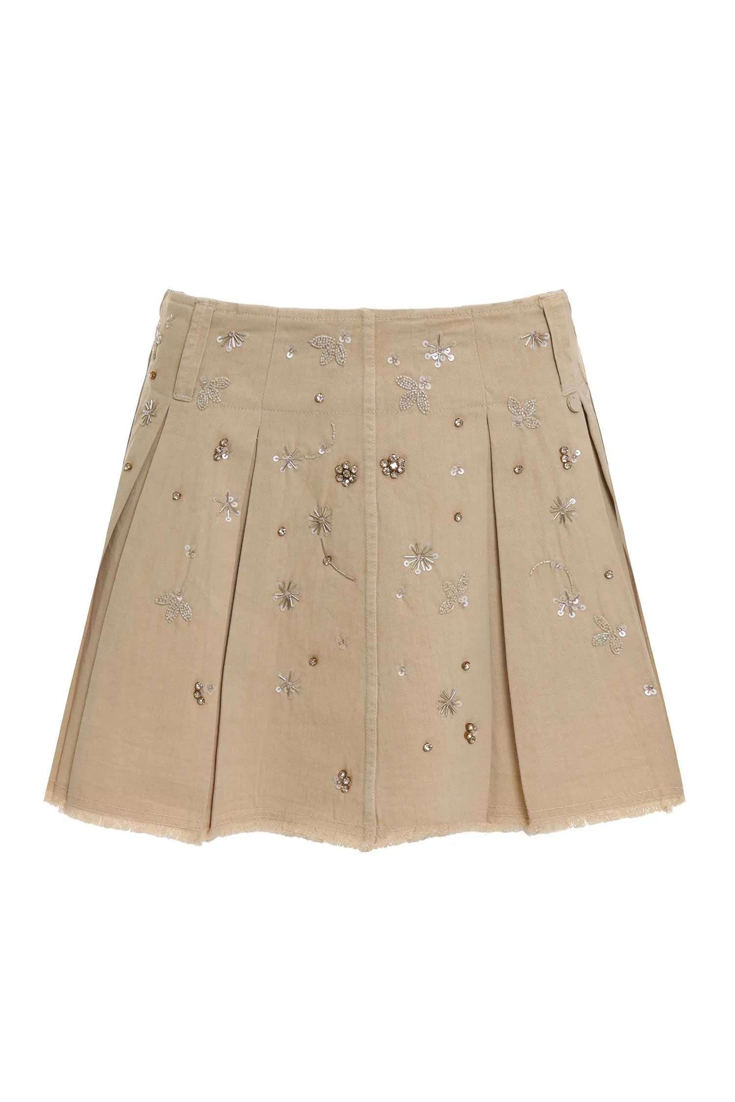 ЮБКА БЕЖЕВАЯ В СКЛАДКУ, ОТД.ВЫШИТЫМИ ЦВЕТАМИ ИЗ БУСИН, КОРОТКАЯ