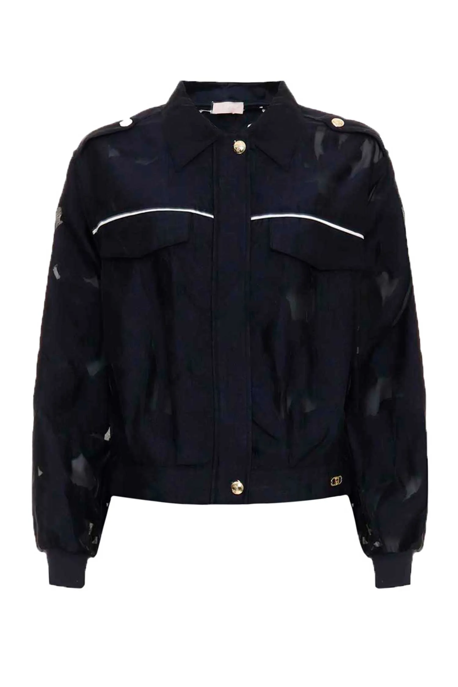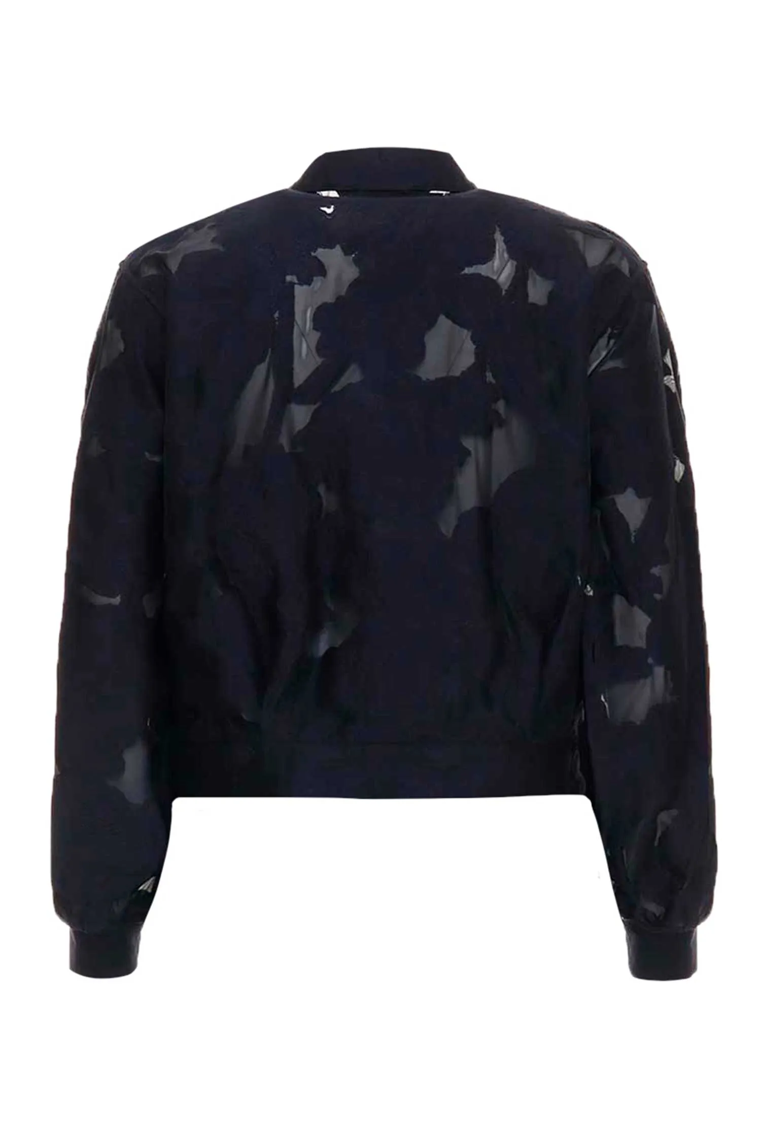 ОЛИМПИЙКА-БОМБЕР Т/СИНЕ-ЧЁРНАЯ ИЗ ЖАККАРДОВОЙ ОРГАНЗЫ, НА ГРУДИ БЕЛЫЙ КАНТ, НА МОЛНИИ, ПЛАНКА НА КНОПКАХ, ПОГОНЫ