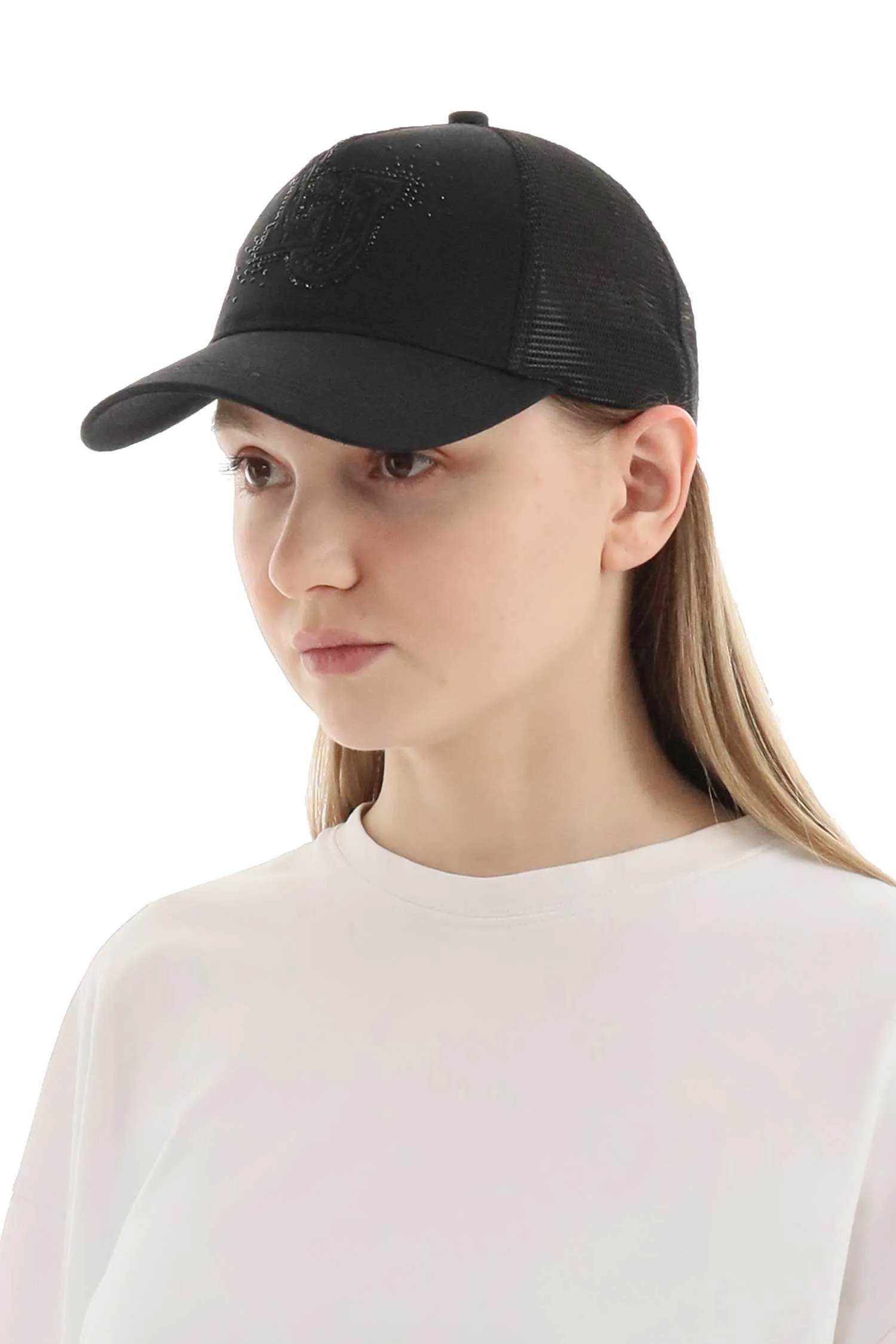 БЕЙСБОЛКА ЧЁРНАЯ, КОМБИНИР., ТЕКСТИЛЬ+СЕТКА, СПЕРЕДИ ЛОГО-БУКВЫ И СТРАЗЫ В ТОН
