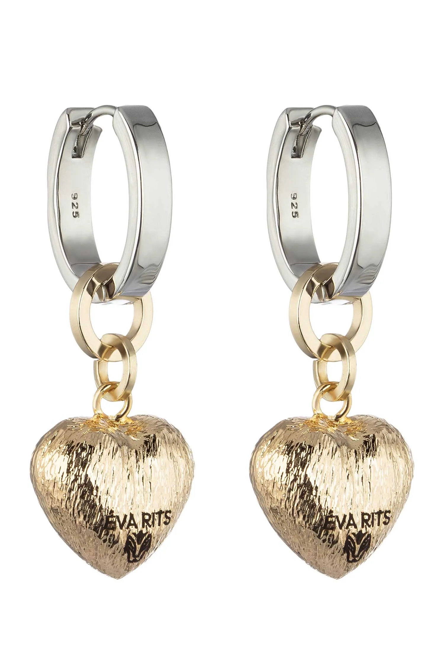 СЕРЬГИ HEARTS GOLD СЕРЕБРИСТО-ЗОЛОТИСТЫЕ, ОБЪЁМНАЯ ПОДВЕСКА-СЕРДЦЕ С ЛОГО-НАДПИСЬЮ