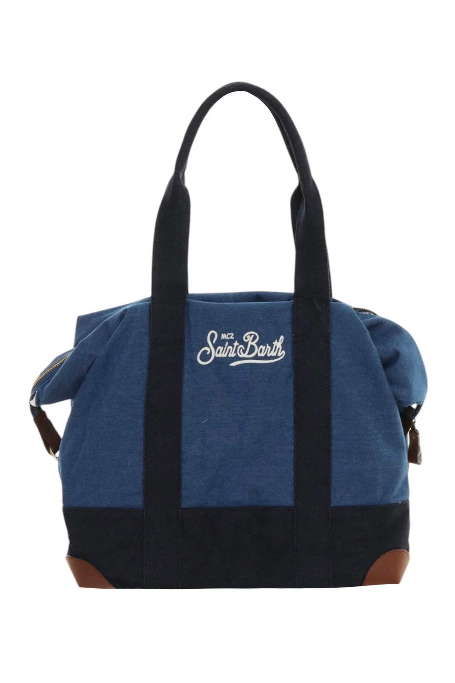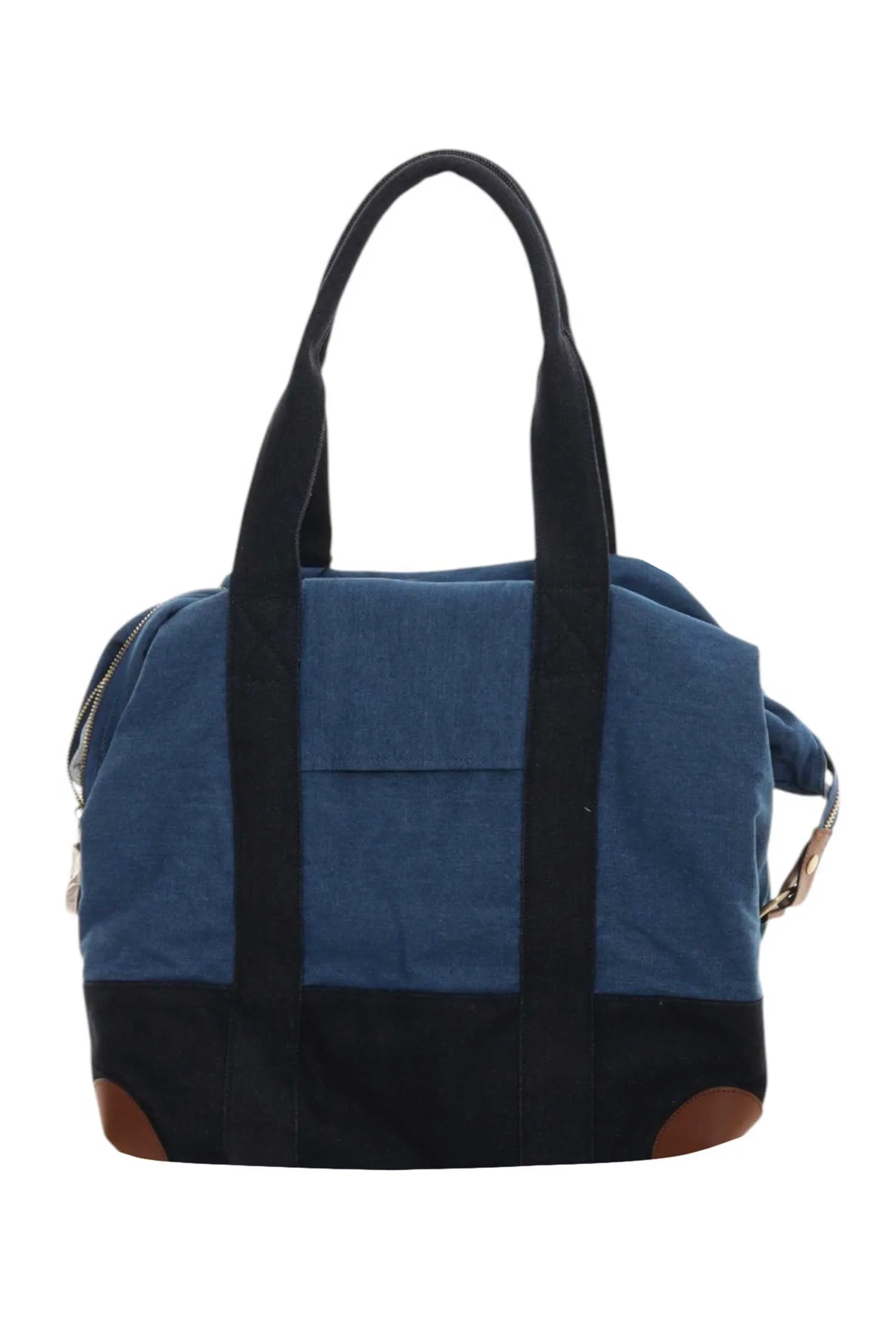 СУМКА TRAVEL BAG Т/СИНЕ-СИНЯЯ С ОТД.ИЗ КОРИЧНЕВОЙ ЭКОКОЖИ, ДЖИНСОВАЯ, БОЛЬШАЯ, ДОП.ОТДЕЛЕНИЕ НА ЛИПУНАХ, ТЕКСТИЛЬНЫЕ РУЧКИ