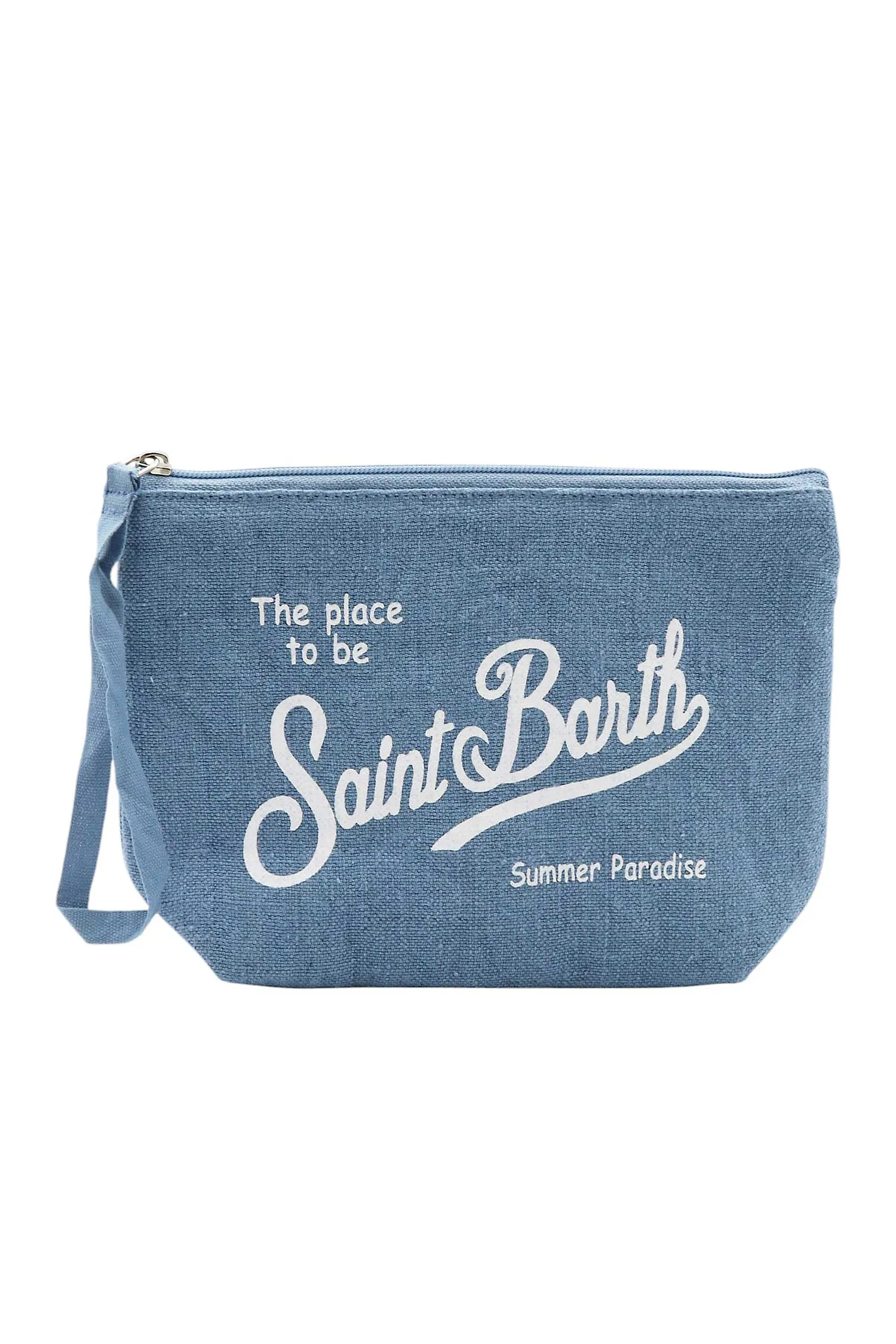 КОСМЕТИЧКА ALINE ГОЛУБАЯ ИЗ ЛЬНА, НА МОЛНИИ, БЕЛАЯ ЛОГО-НАДПИСЬ, ТЕКСТИЛЬНЫЙ РЕМЕШОК НА РУКУ