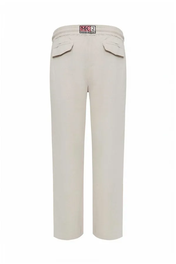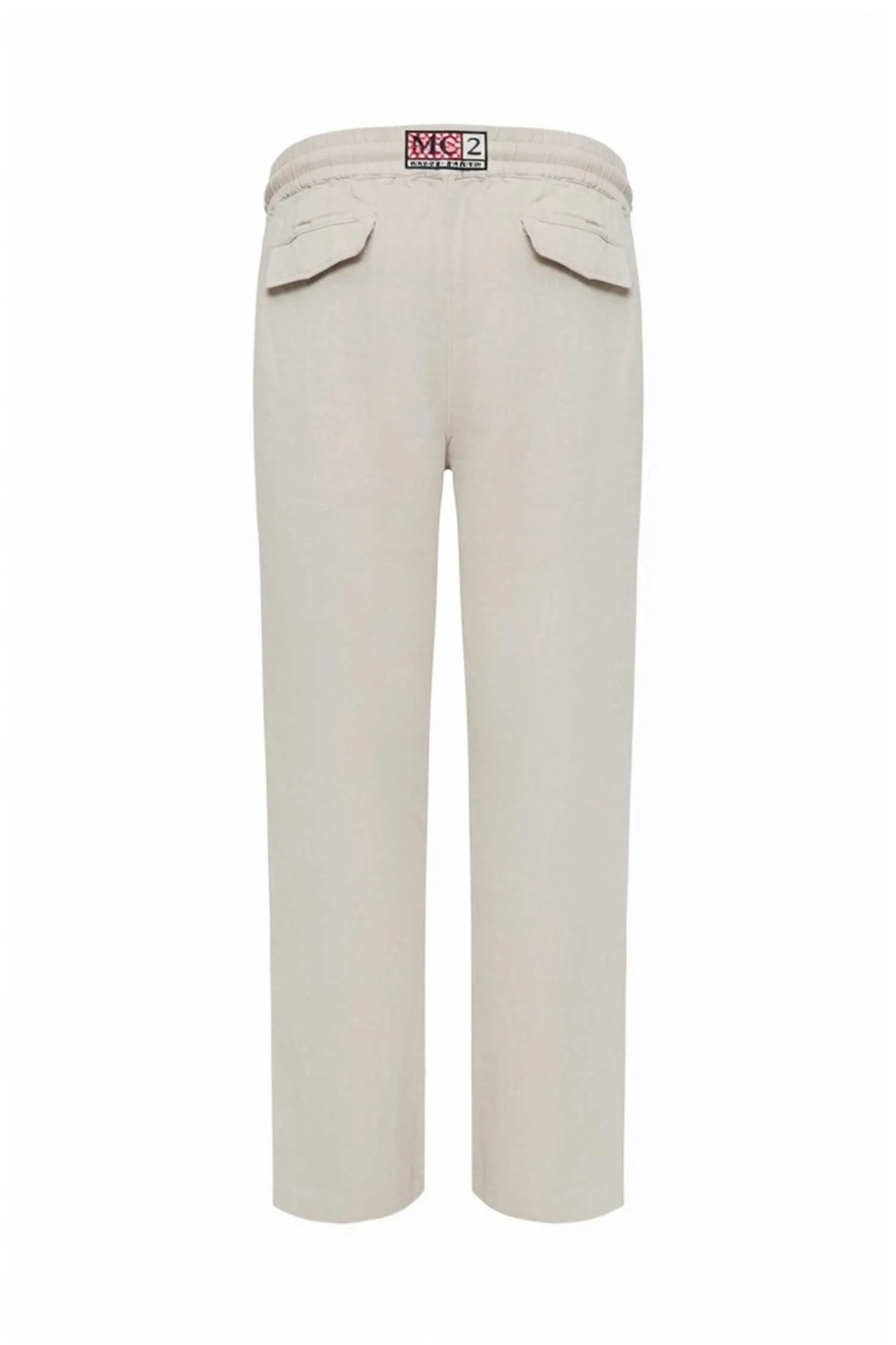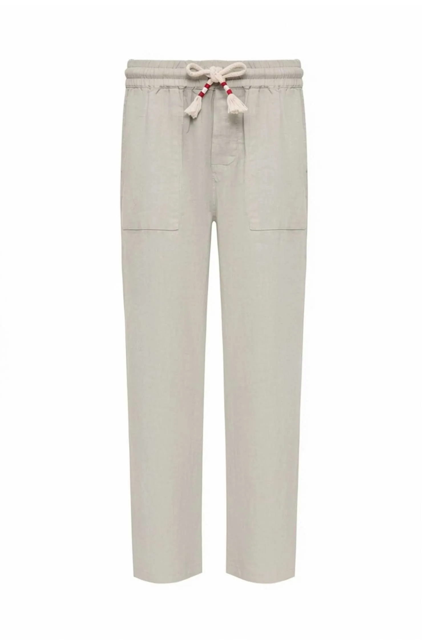 MC2 SAINT BARTH БРЮКИ CALAIS БЕЖЕВО-СЕРЫЕ ЛЁН, ПРЯМЫЕ, ЭЛАСТИЧНЫЙ ПОЯС НА КУЛИСКЕ, СЗАДИ КАРМАНЫ С КЛАПАНОМ, НАШИВКА-ЛОГО