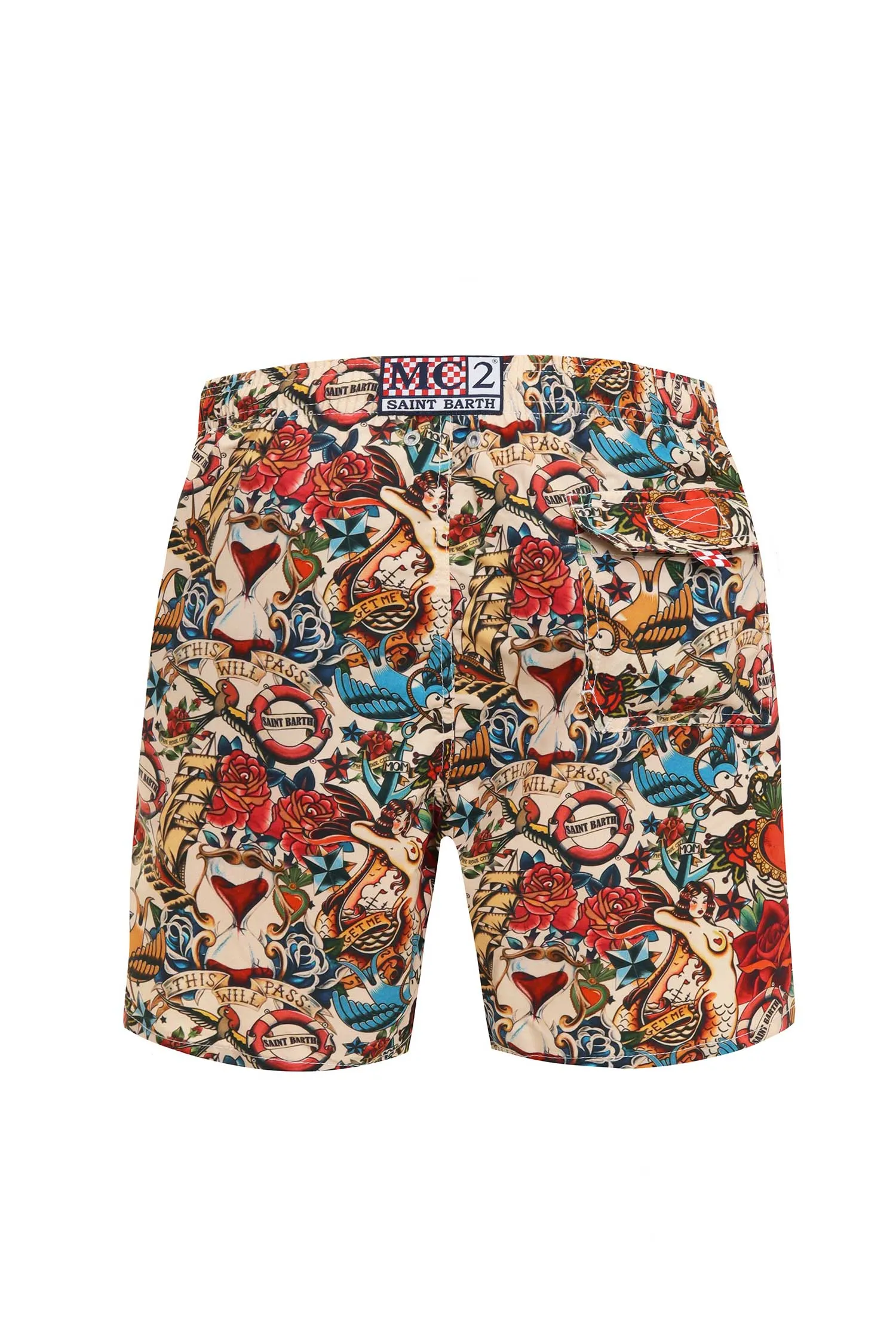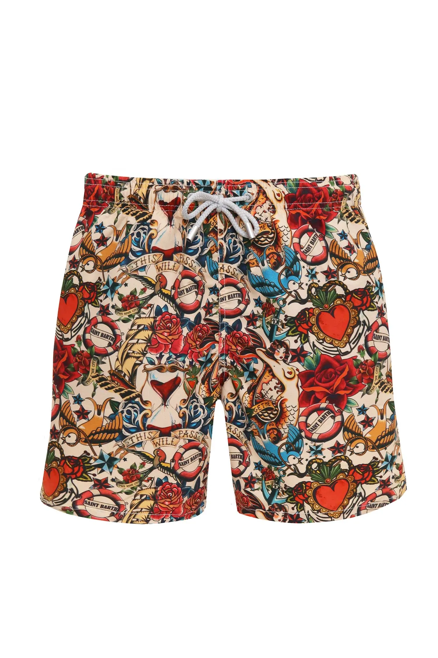 MC2 SAINT BARTH ШОРТЫ GUSTAVIA БЕЖЕВО-КРАСНЫЕ, ПЛАВАТЕЛЬНЫЕ, ПРИНТ СЕРДЦА И ПТИЦЫ, ПОЯС НА КУЛИСКЕ, СЗАДИ КАРМАН С КЛАПАНОМ НА ЛИПУНЕ