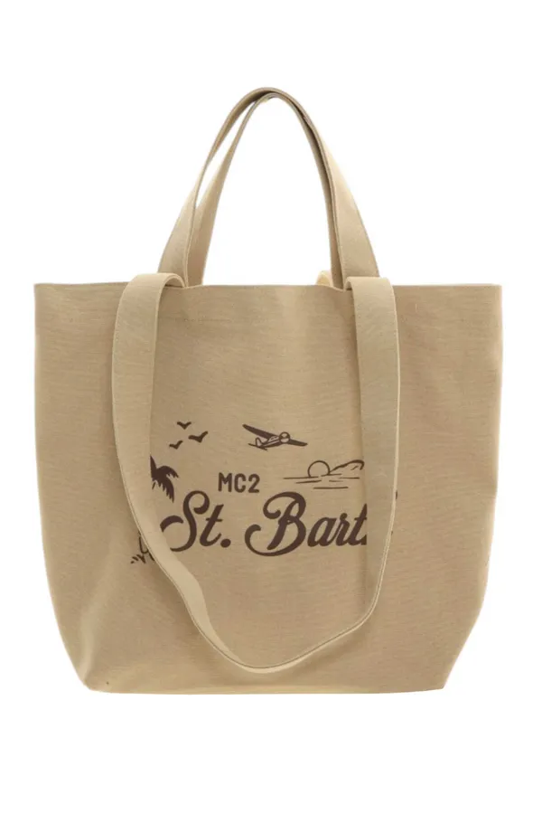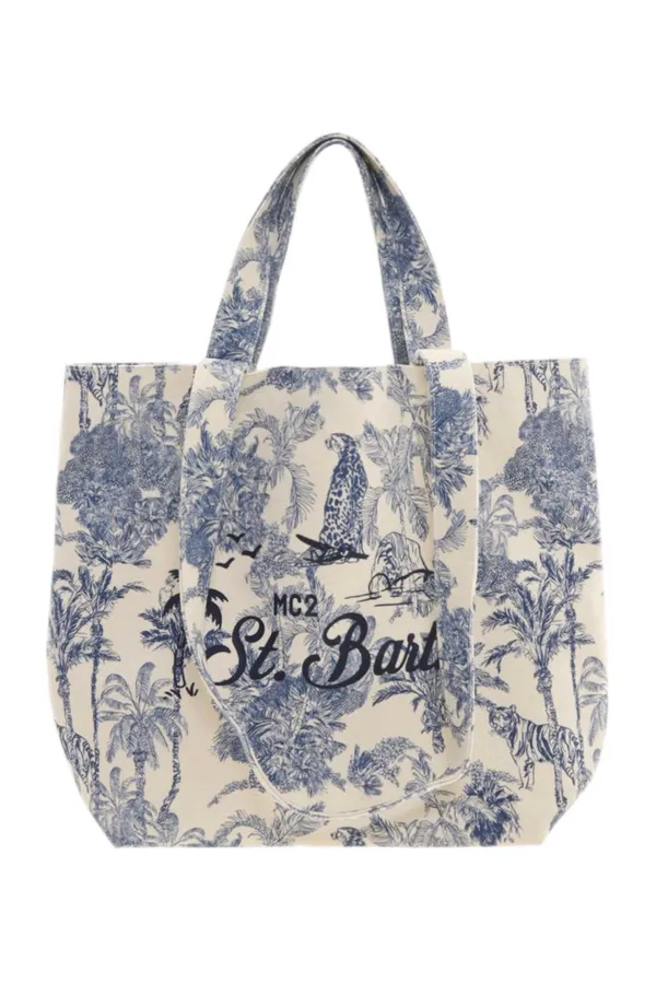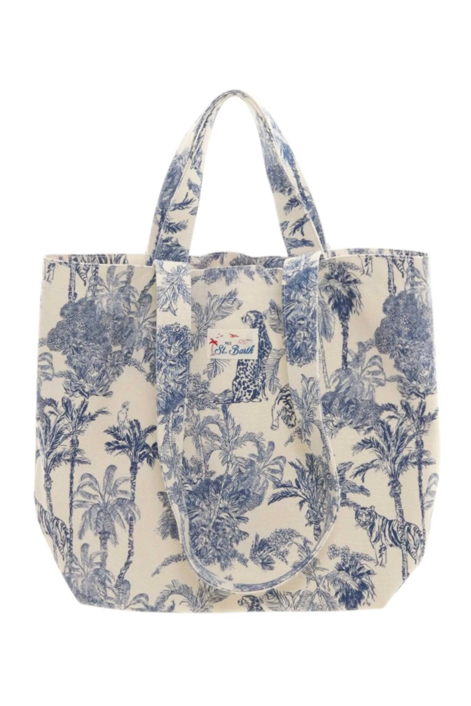 СУМКА-ШОПЕР ESSENTIAL BEACH COTTON МОЛОЧНАЯ, БОЛЬШАЯ, ПРИНТ СИНИЕ ПАЛЬМЫ, Т/СИНЯЯ ЛОГО-НАДПИСЬ, ДВОЙНЫЕ РУЧКИ