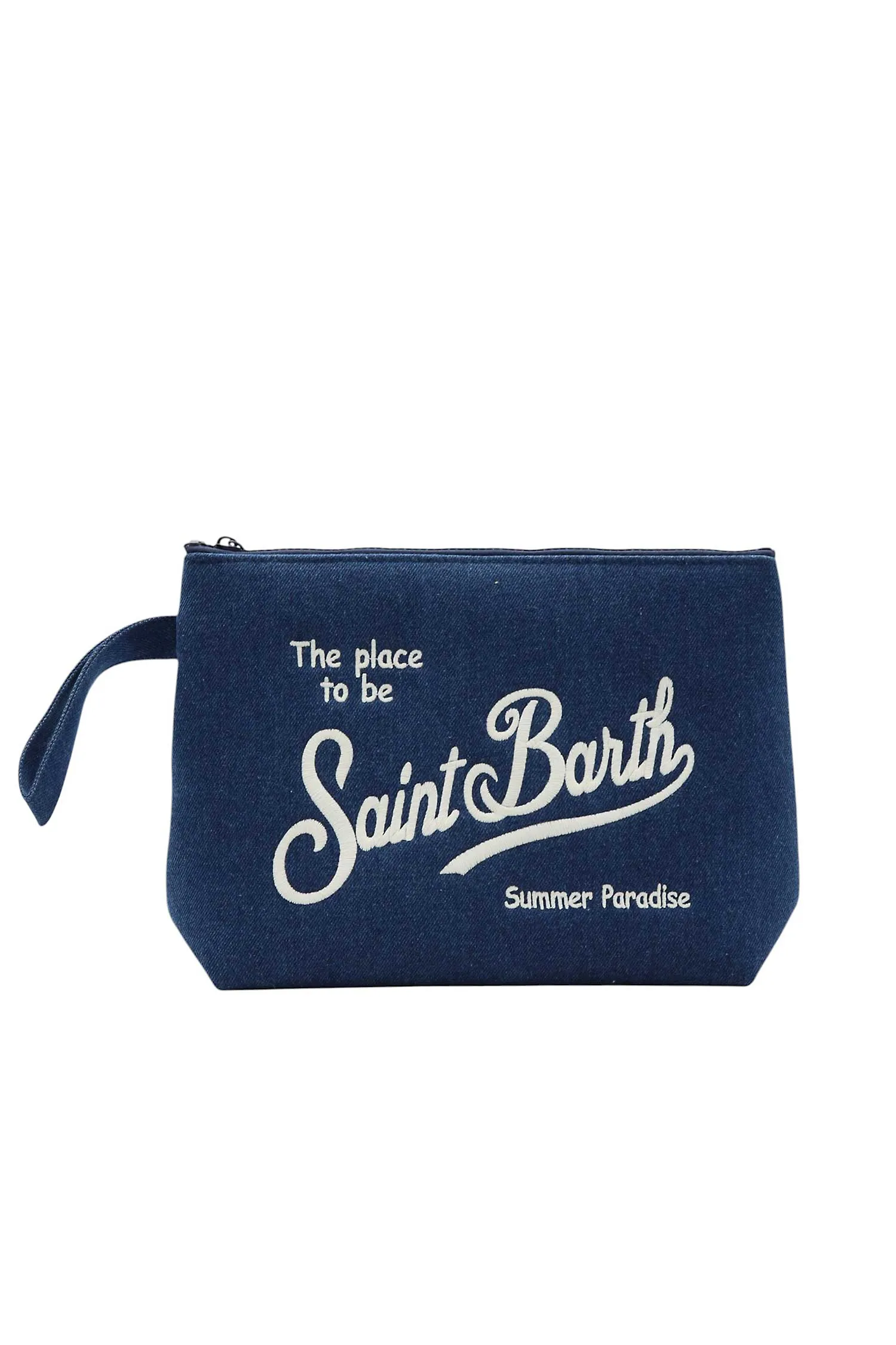 КОСМЕТИЧКА ALINE L СИНЯЯ, ДЖИНСОВАЯ, НА МОЛНИИ, ВЫШИТАЯ БЕЛАЯ ЛОГО-НАДПИСЬ, РЕМЕШОК НА РУКУ