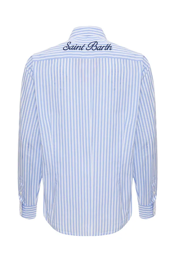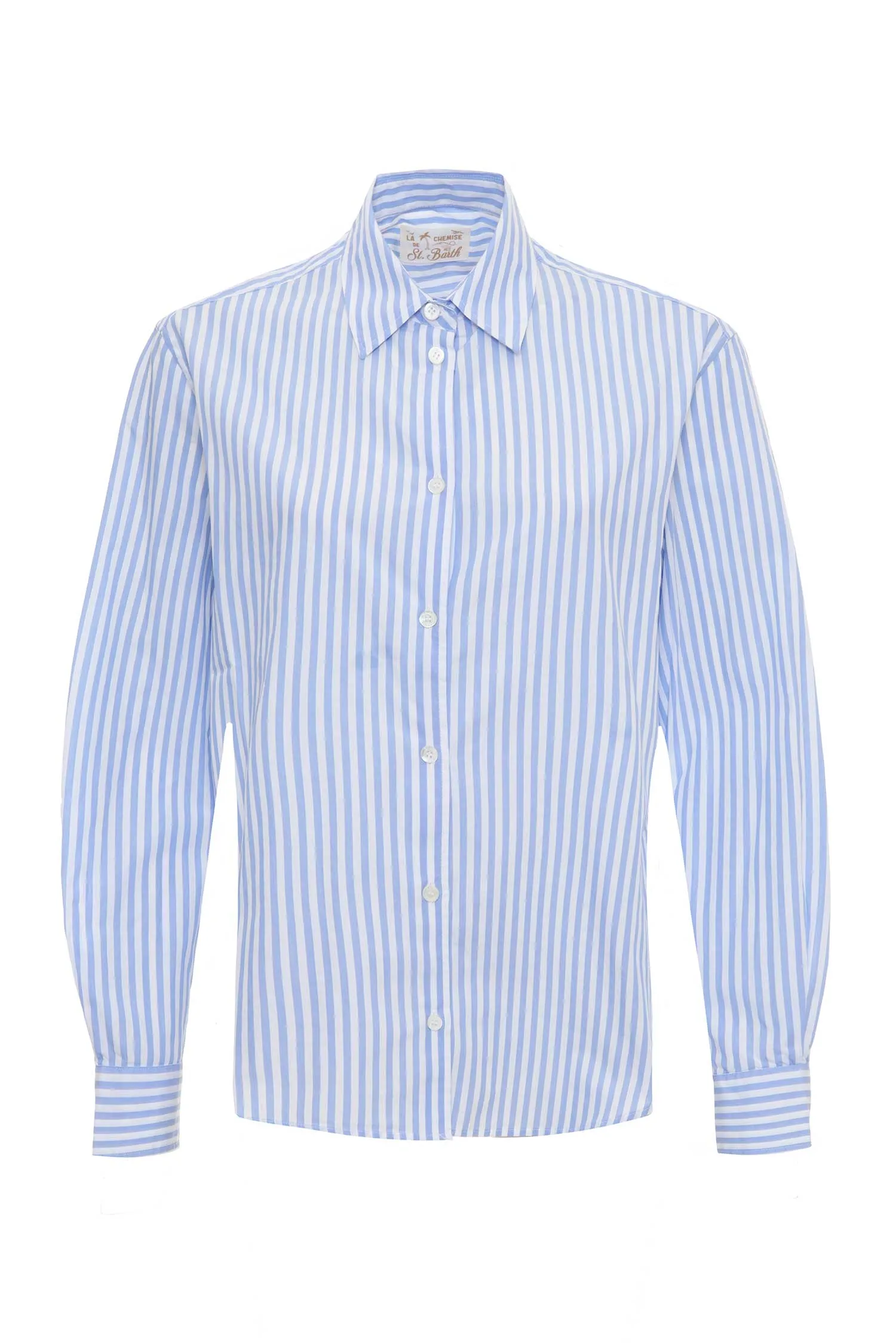 РУБАШКА MEREDITH БЕЛО-ГОЛУБАЯ В ПОЛОСКУ, ПРИТАЛЕННАЯ, НА СПИНЕ ВЫШИТАЯ Т/СИНЯЯ ЛОГО-НАДПИСЬ, ДЛ/РУК.
