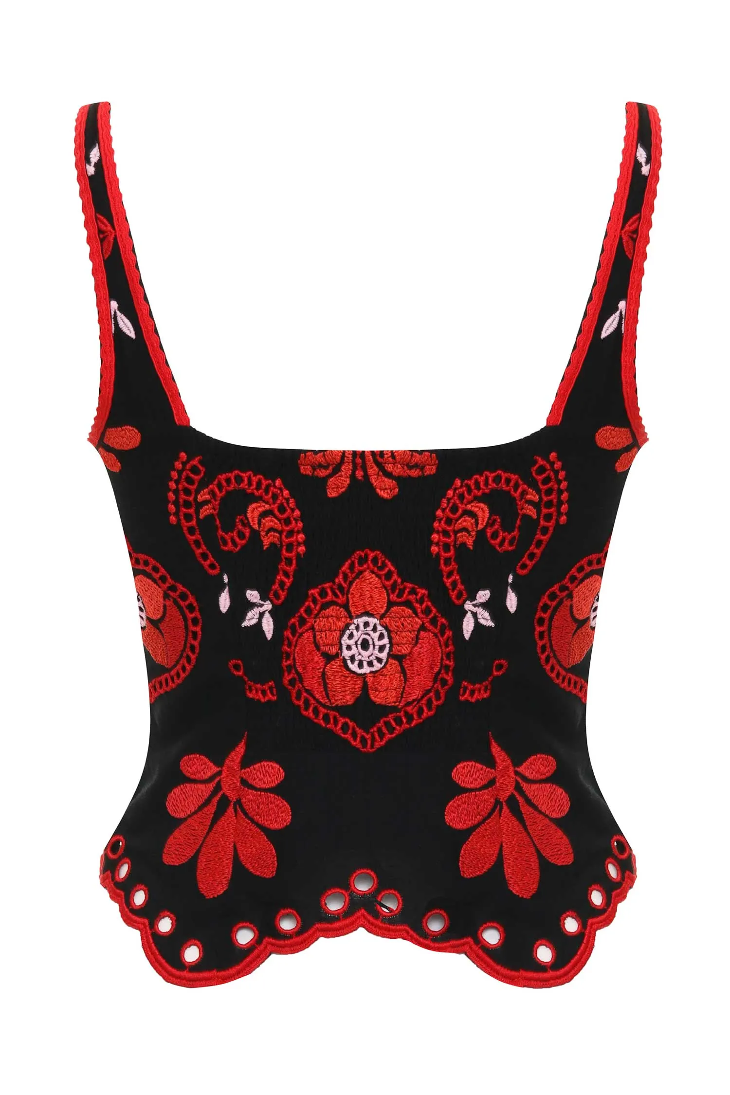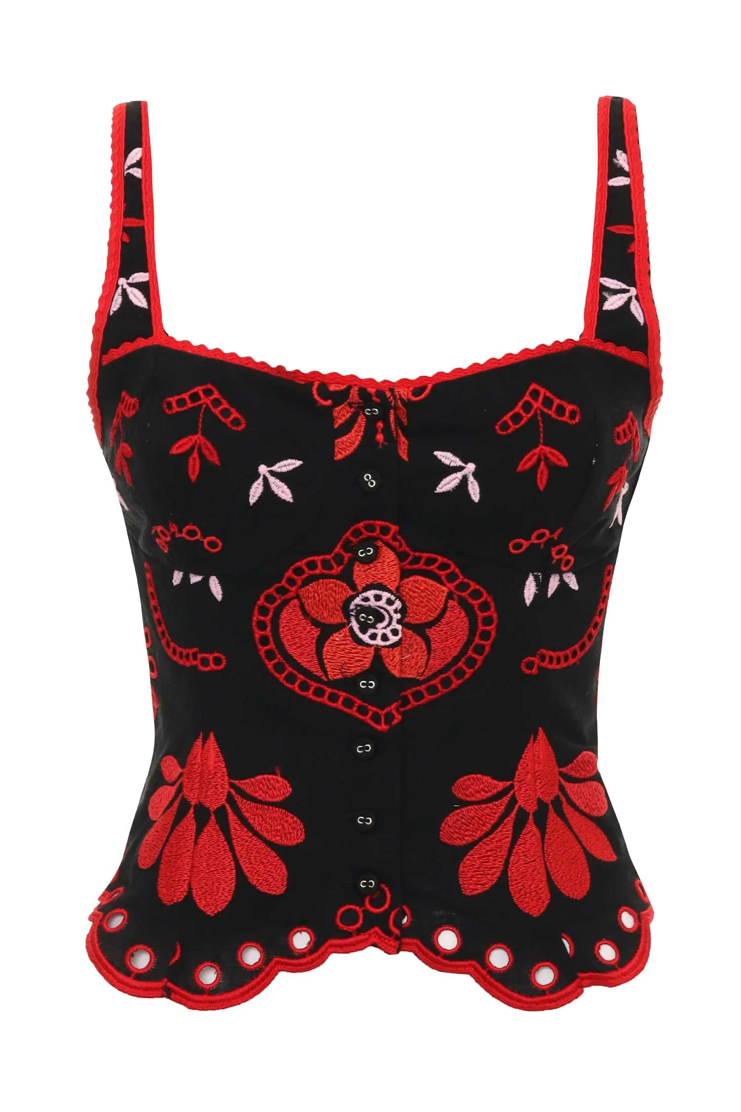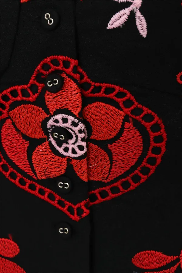 CHARO RUIZ IBIZA ТОП LOE ЧЁРНЫЙ С ВЫШИТЫМИ КРАСНЫМИ ЦВЕТАМИ, ЛЁН, УКОРОЧЕННЫЙ, НА ПУГОВИЦАХ, БРЕТЕЛЬКИ ОТД.КРАСНОЙ ТЕСЬМОЙ