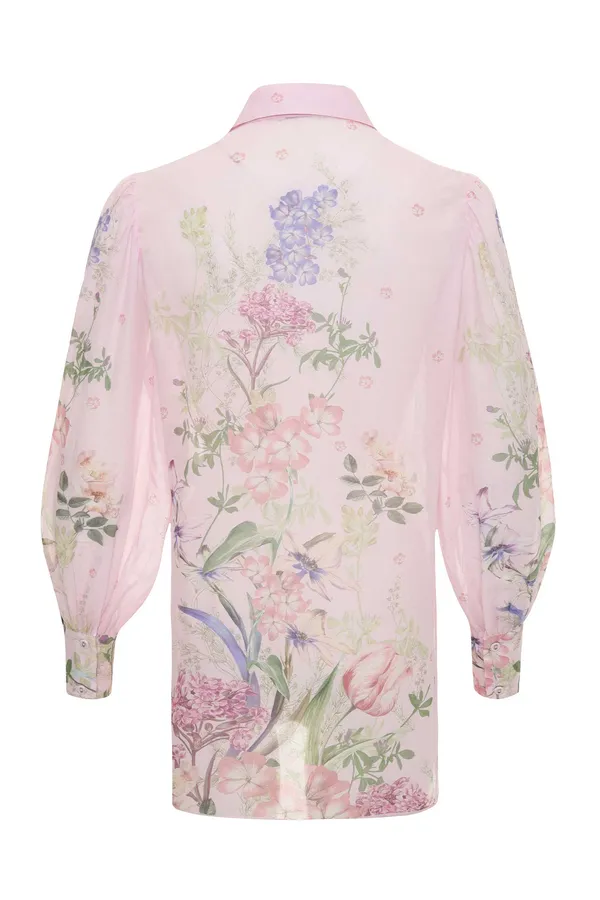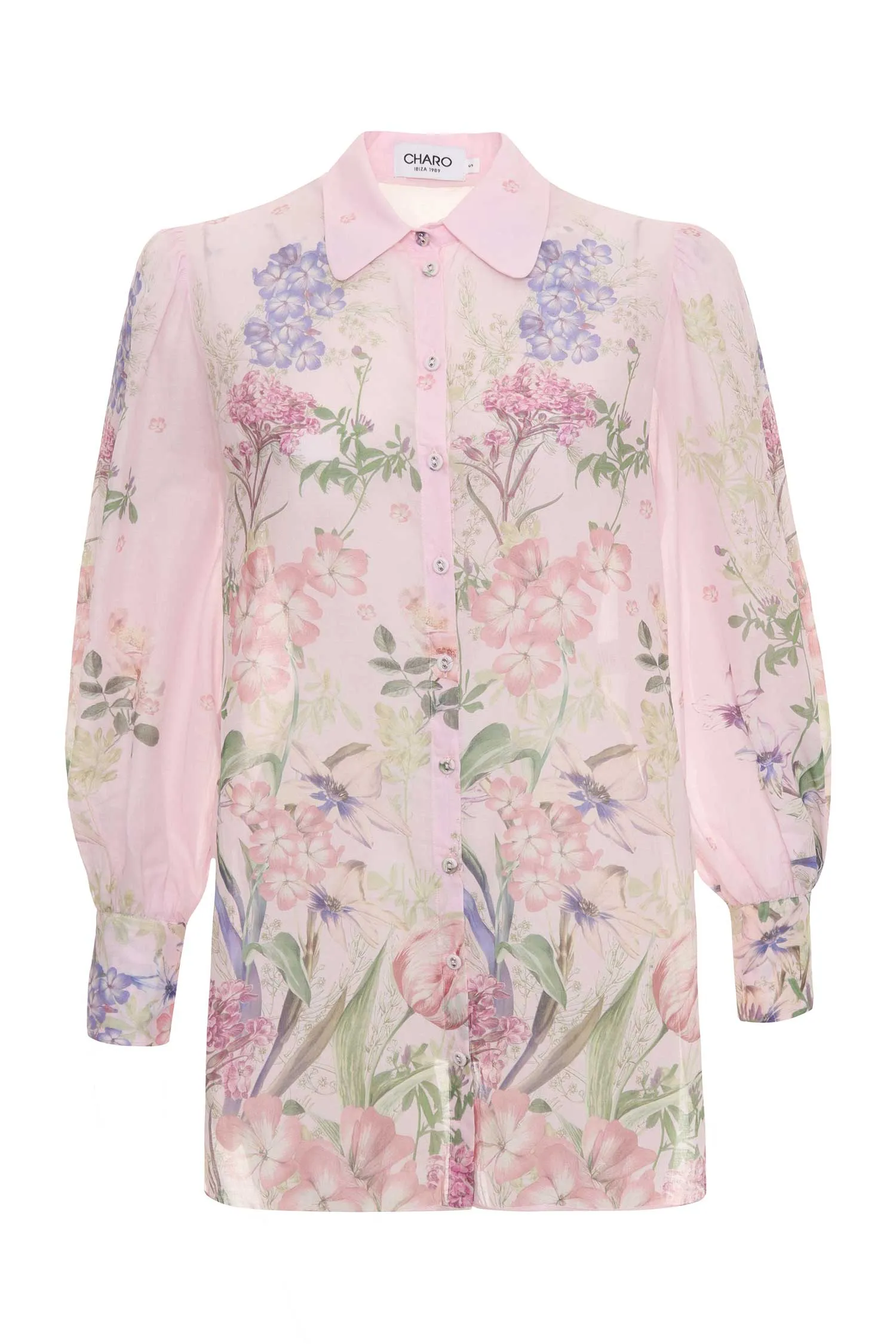 CHARO RUIZ IBIZA РУБАШКА ASTER РОЗОВАЯ С ВЫСОКИМИ РАЗРЕЗАМИ, ПРИНТ СИРЕНЕВЫЕ/РОЗОВЫЕ ЦВЕТЫ, СВОБОДНАЯ, ДЛ/РУК.