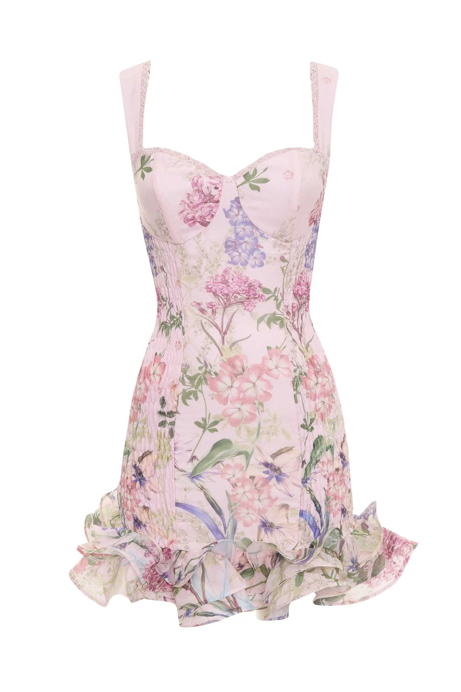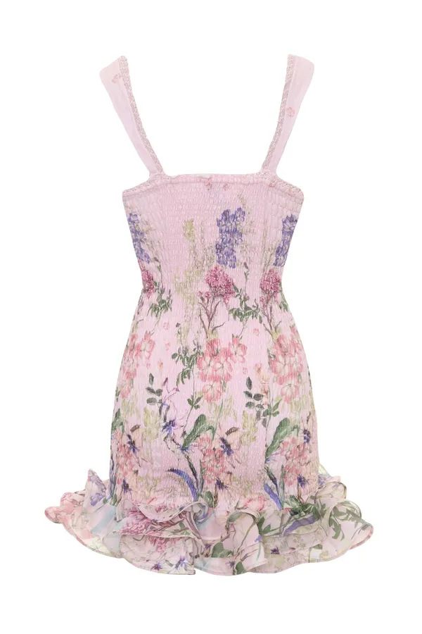 CHARO RUIZ IBIZA ПЛАТЬЕ-РЕЗИНКА SUNIL РОЗОВОЕ, ПРИНТ СИРЕНЕВЫЕ/РОЗОВЫЕ ЦВЕТЫ, КОРОТКОЕ, ОТД.КРУЖЕВОМ, СНИЗУ РЮШИ, БРЕТЕЛЬКИ