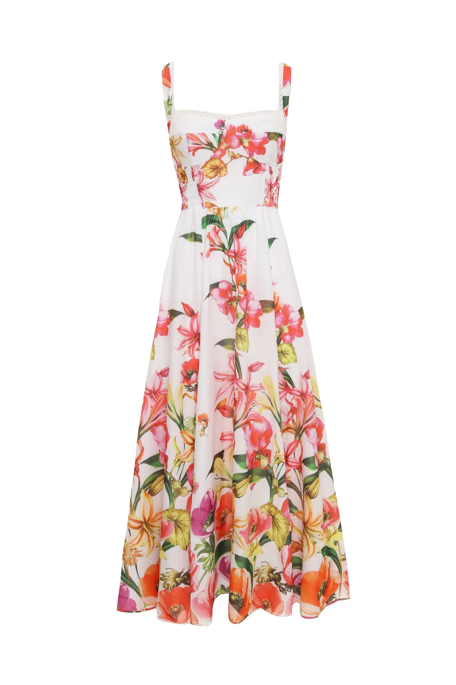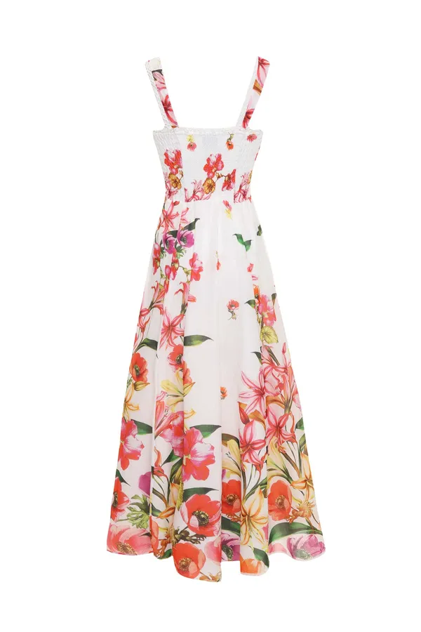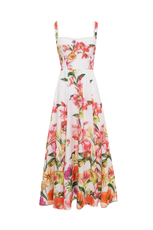САРАФАН MAUI БЕЛЫЙ С РАЗРЕЗАМИ, ПРИНТ ОРАНЖЕВЫЕ ЦВЕТЫ, ДЛИННЫЙ, РАСКЛЕШЁННЫЙ, ЛИФ-РЕЗИНКА, БРЕТЕЛЬКИ ОТД.КРУЖЕВОМ