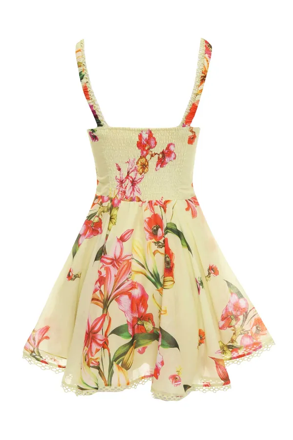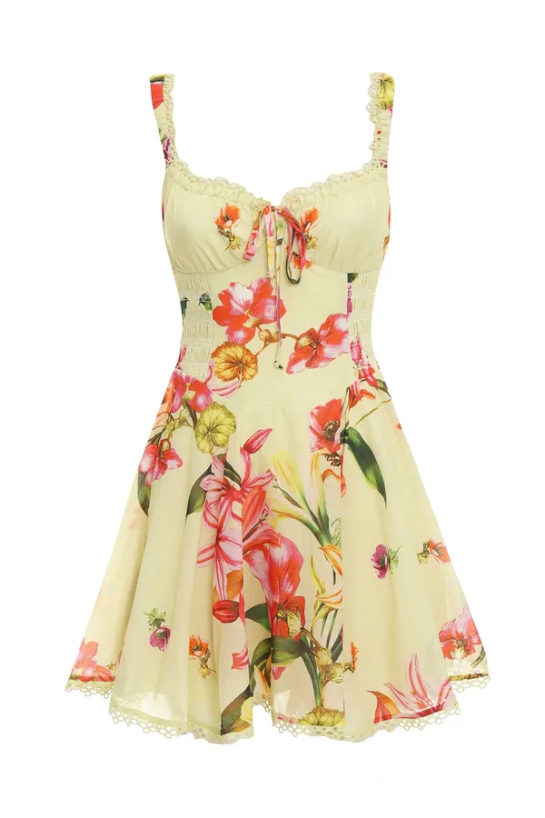 САРАФАН BORA ЖЁЛТЫЙ, ПРИНТ ОРАНЖЕВЫЕ ЦВЕТЫ, КОРОТКИЙ, ОТД.КРУЖЕВОМ, ЮБКА-СОЛНЦЕ, ПРИСБОРЕННЫЕ БРЕТЕЛЬКИ