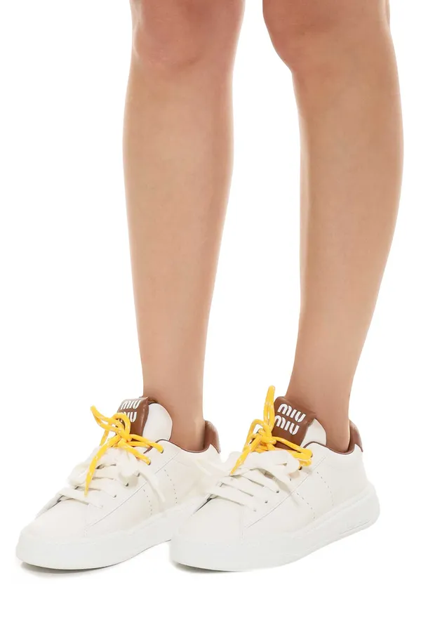 Кеды Miu Miu выполнены из гладкой телячьей кожи и сочетают спортивный характер с фирменной игривой эстетикой марки. Двойная шнуровка добавляет образу динамику и визуальную глубину, а перфорированный верх улучшает вентиляцию при повседневной носке. Кожаная подкладка и стелька обеспечивают комфорт, а резиновая подошва отвечает за устойчивость и износостойкость. Универсальная модель, которая легко вписывается в городской гардероб и работает как стильный акцент в расслабленных образах.