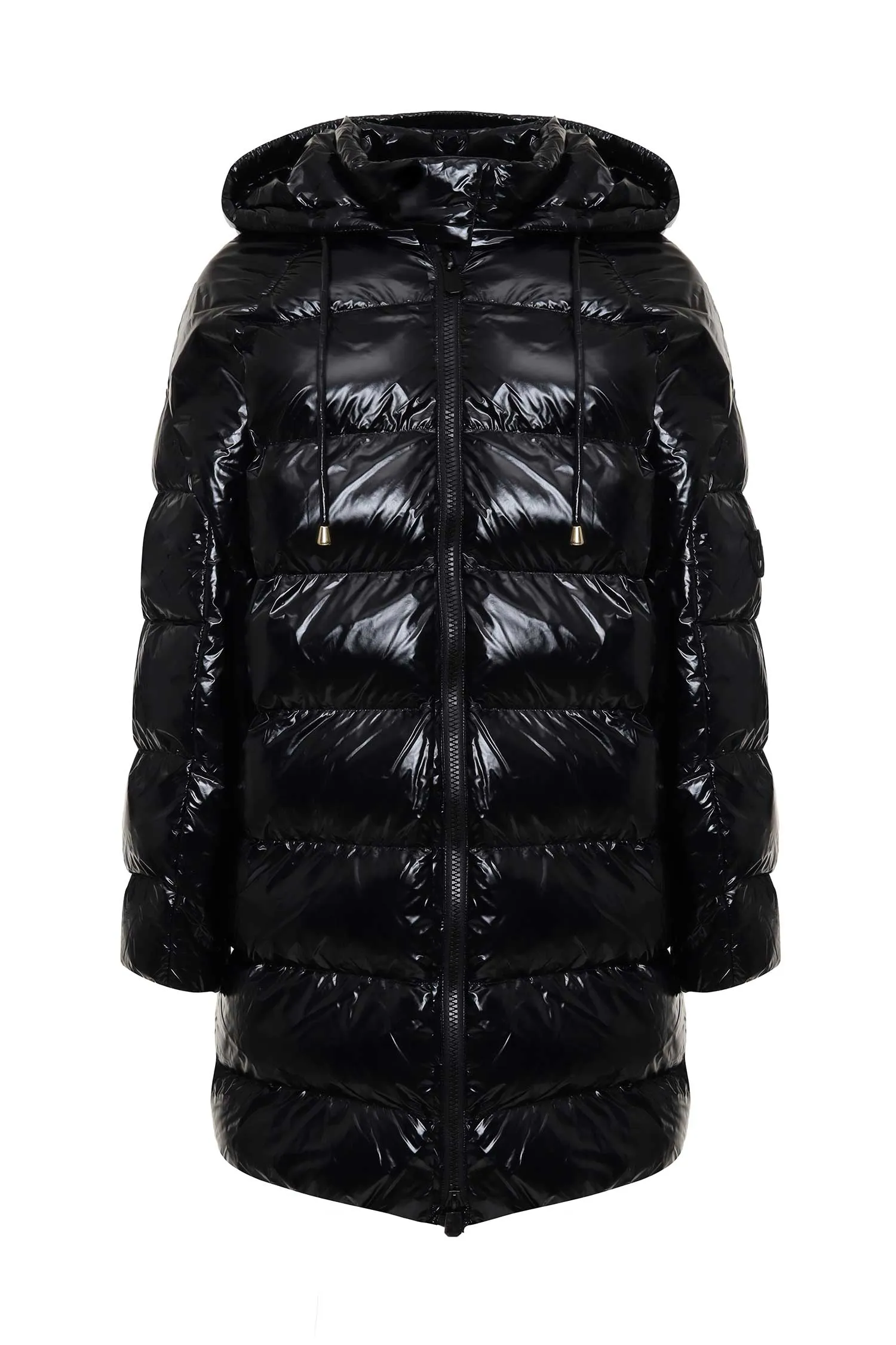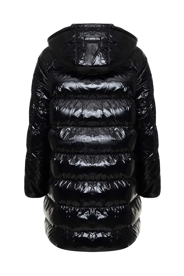 ПУХОВИК M.335 ЧЁРНЫЙ ЛАК С СИНТЕТ.НАПОЛН., СТЁГАНЫЙ, УДЛИНЁННЫЙ, НАШИВКА-ЛОГО В ТОН, ОТСТЁГИВ.КАПЮШОН, ВОРОТ-СТОЙКА