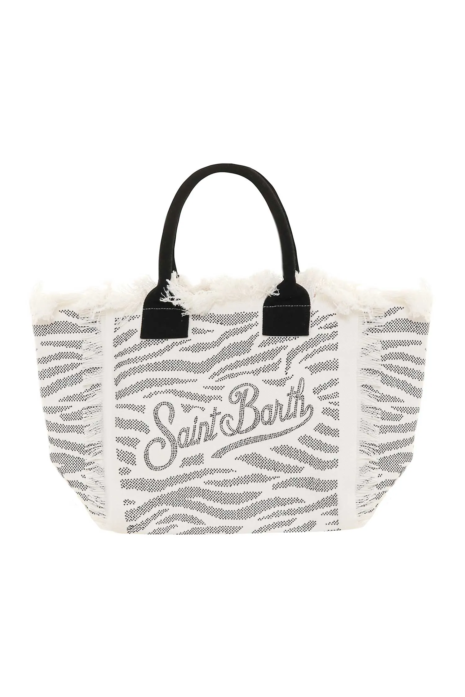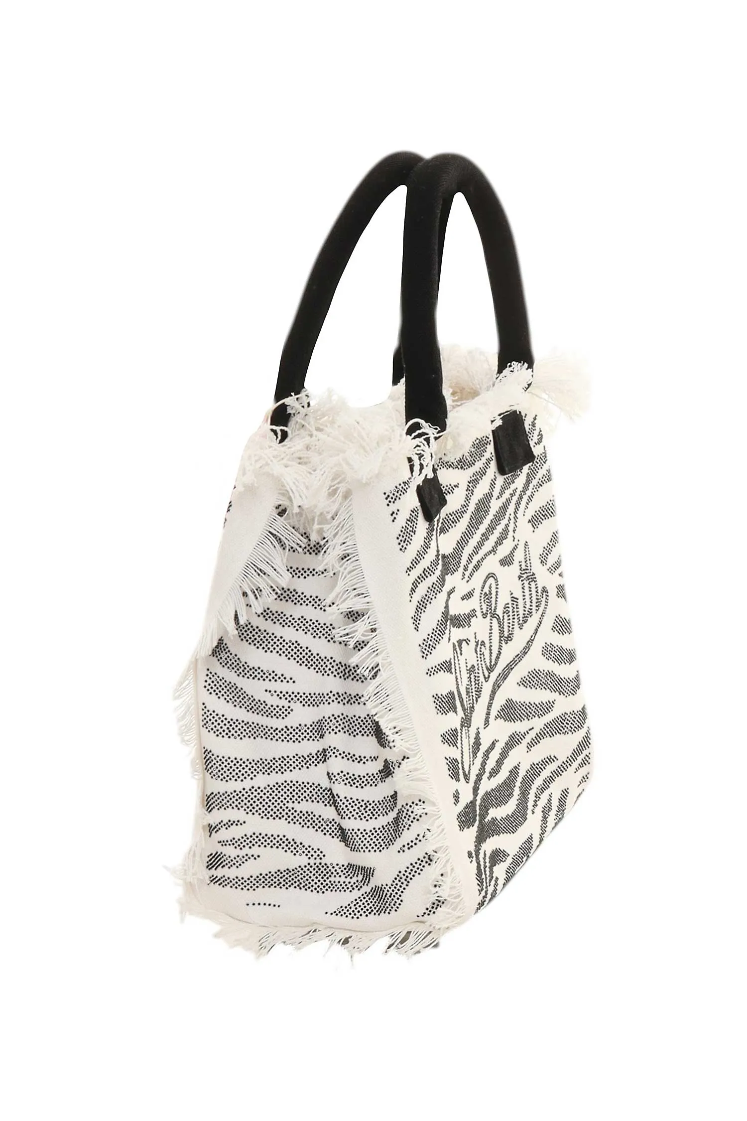СУМКА VANITY ЧЁРНО-БЕЛАЯ В СТРАЗАХ, ПРИНТ ЗЕБРА, БОЛЬШАЯ, ЧЁРНЫЕ РУЧКИ, БАХРОМА