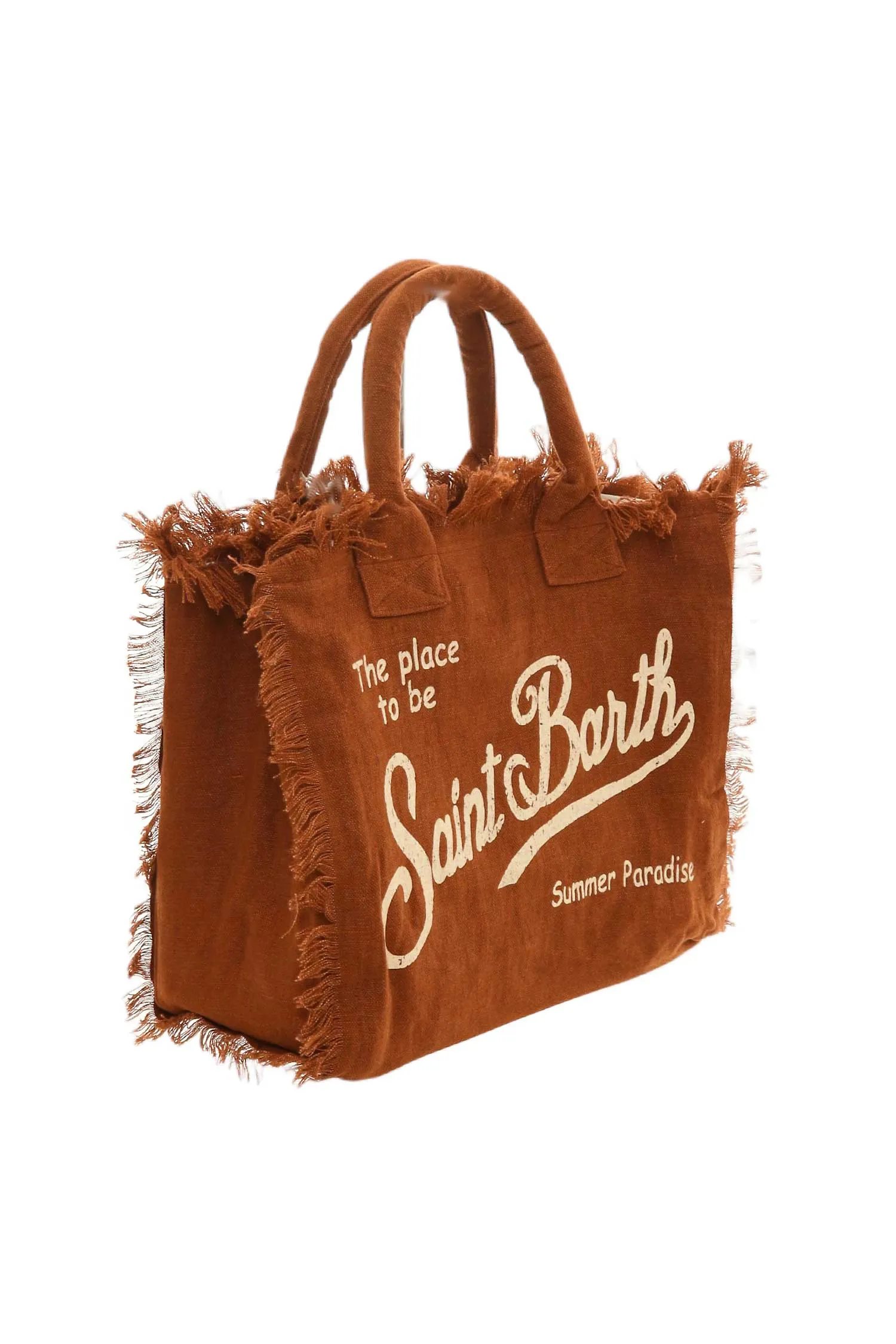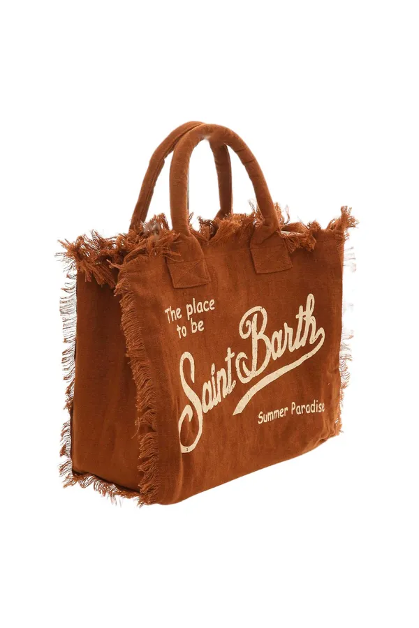 СУМКА VANITY LINEN КОРИЧНЕВАЯ ИЗ ЛЬНА, БОЛЬШАЯ, БЕЖЕВАЯ ЛОГО-НАДПИСЬ, БАХРОМА