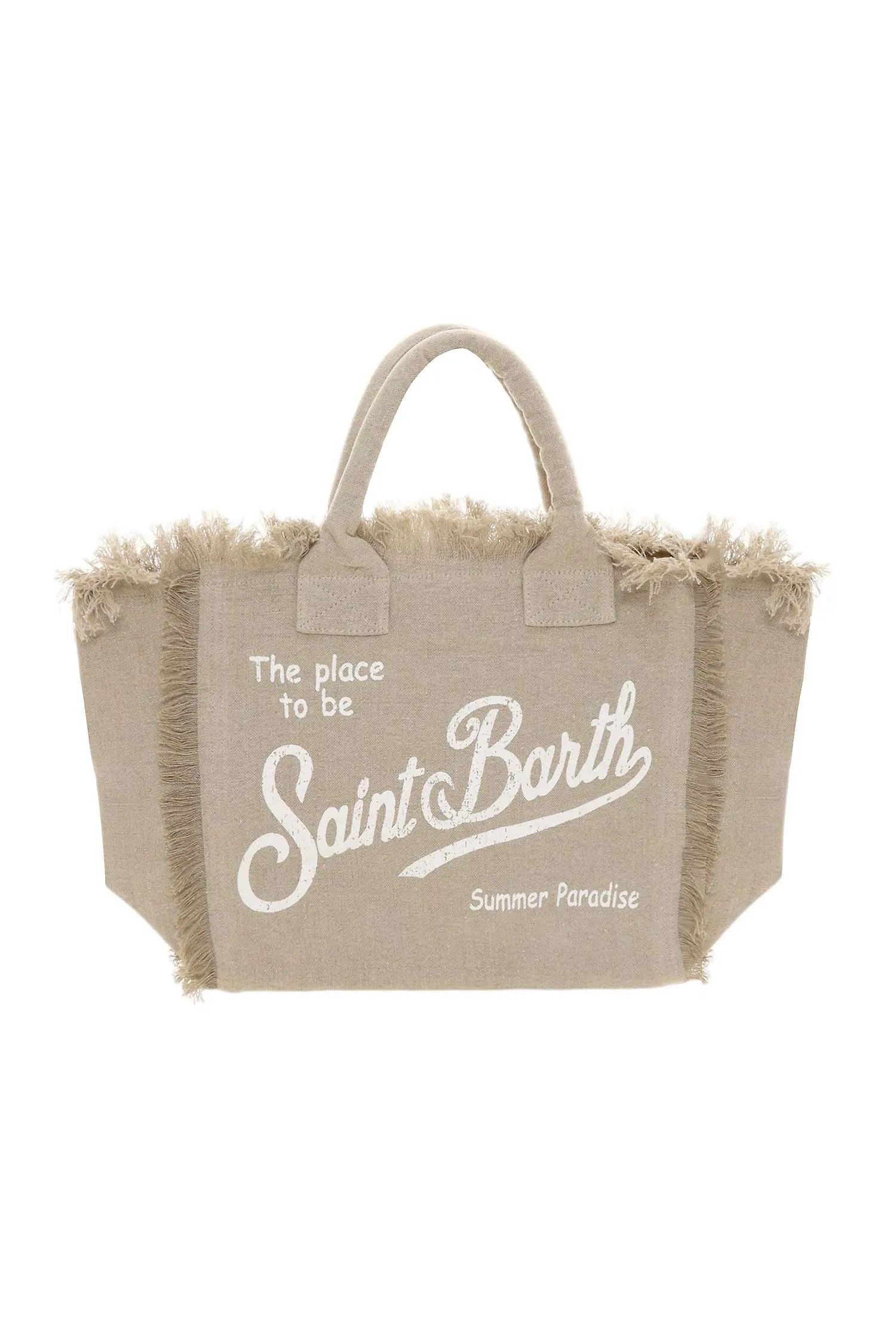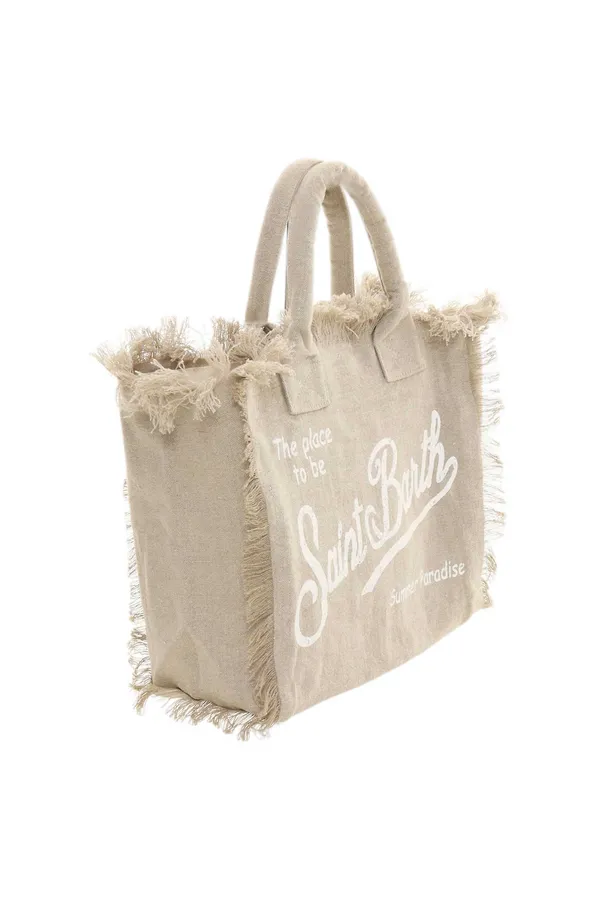 СУМКА VANITY LINEN БЕЖЕВАЯ ИЗ ЛЬНА, БОЛЬШАЯ, БЕЛАЯ ЛОГО-НАДПИСЬ, БАХРОМА