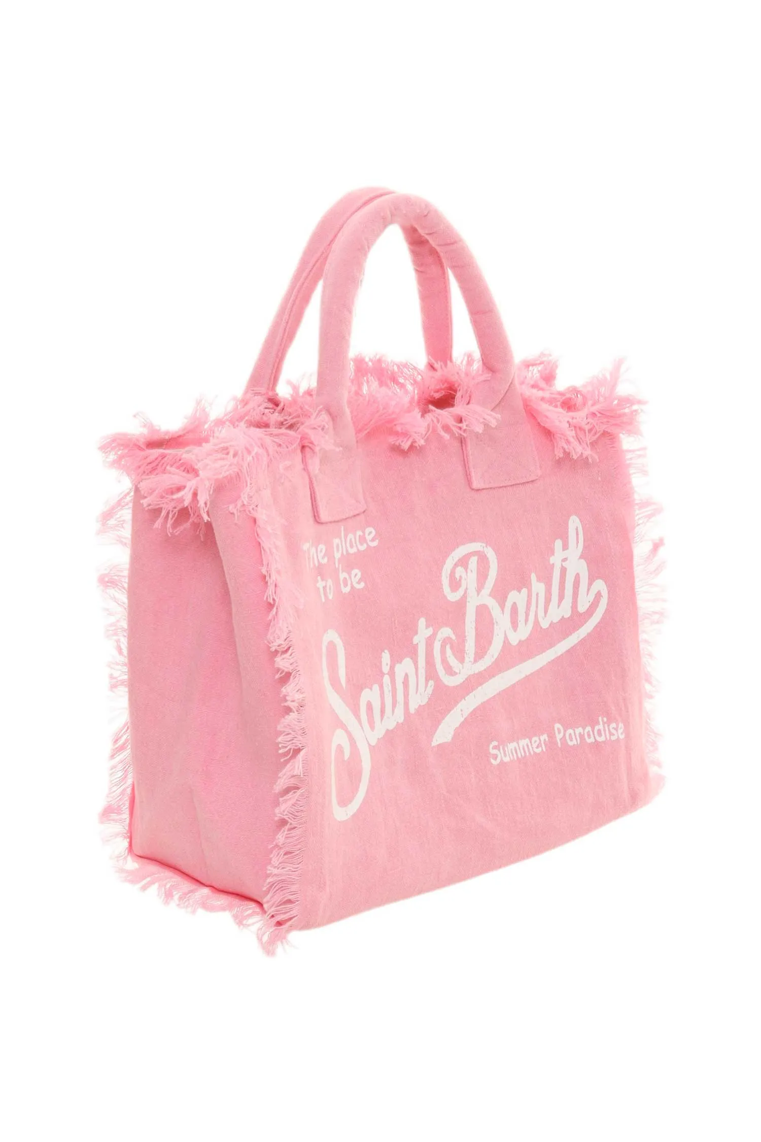 СУМКА VANITY LINEN РОЗОВАЯ ИЗ ЛЬНА, БОЛЬШАЯ, БЕЛАЯ ЛОГО-НАДПИСЬ, БАХРОМА