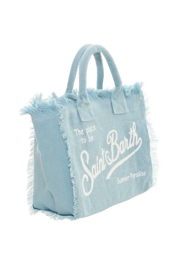 СУМКА VANITY LINEN ГОЛУБАЯ ИЗ ЛЬНА, БОЛЬШАЯ, БЕЛАЯ ЛОГО-НАДПИСЬ, БАХРОМА