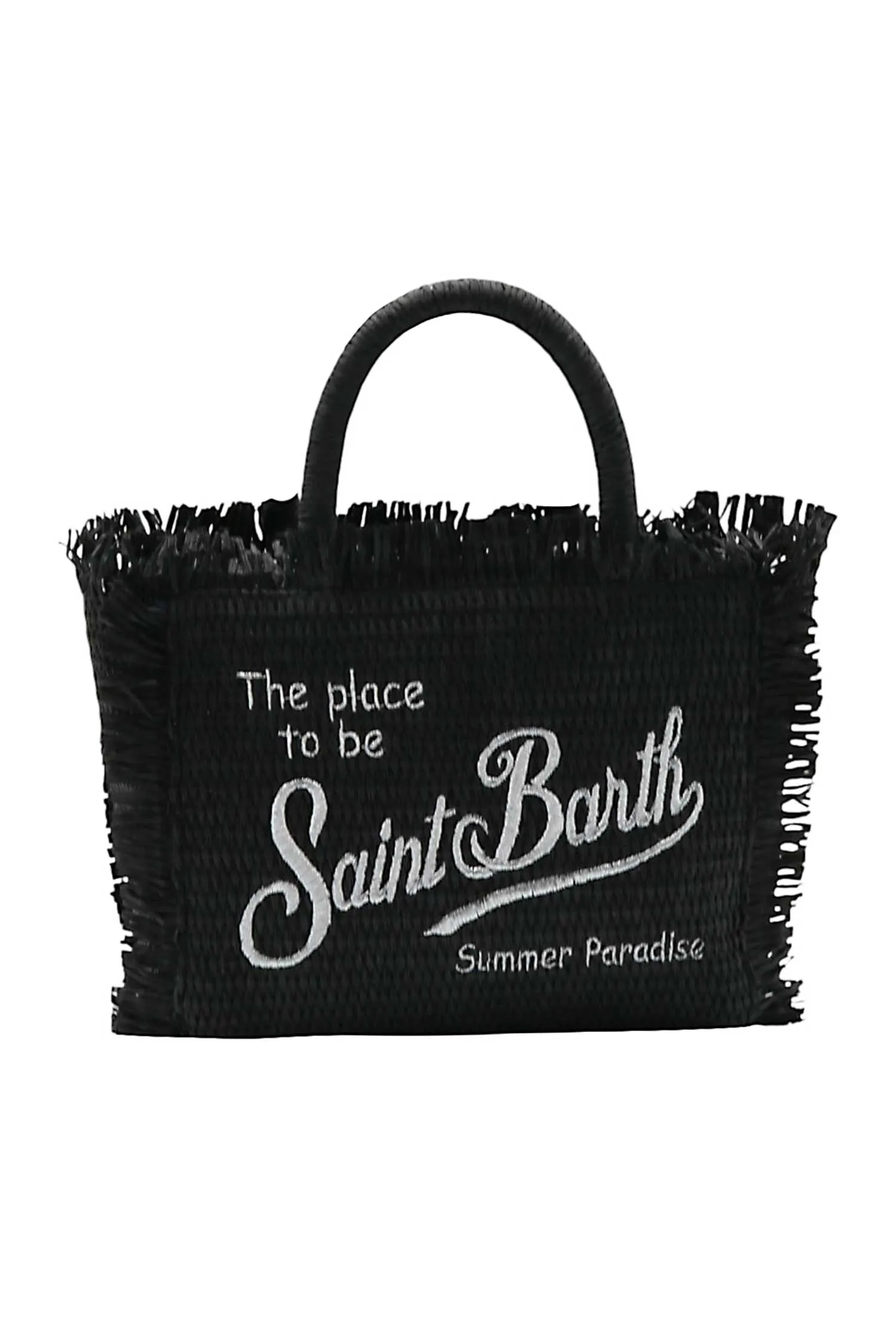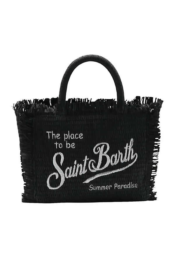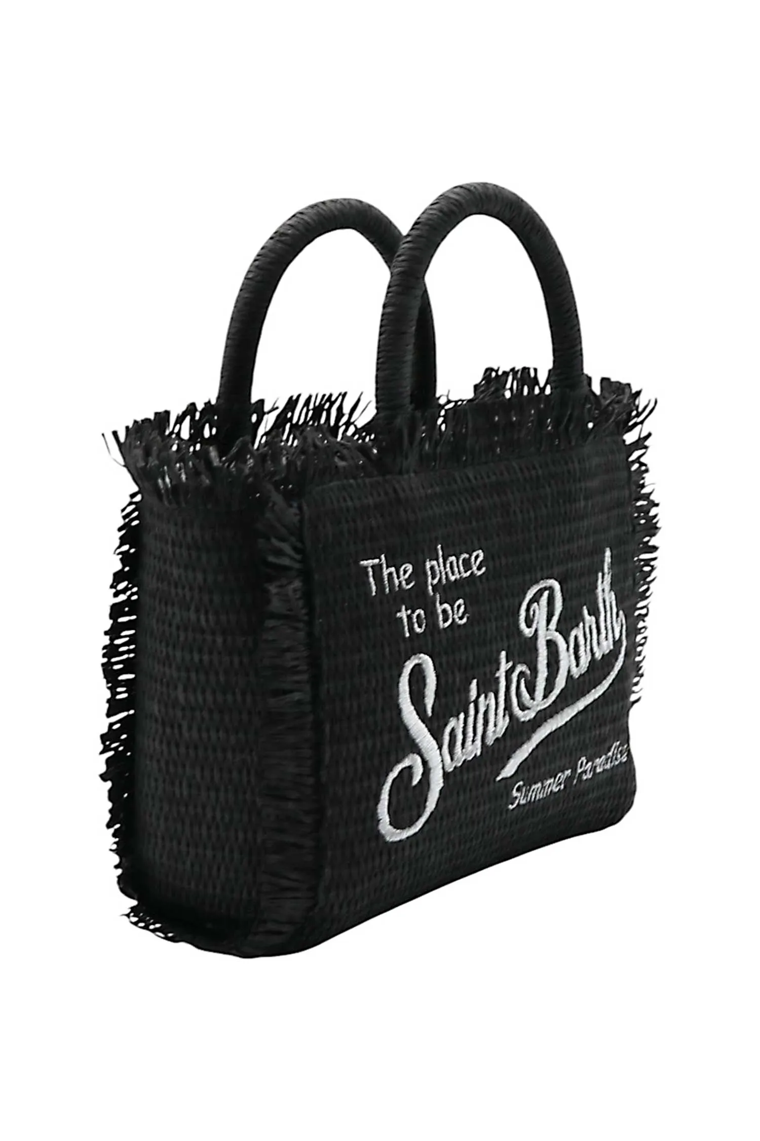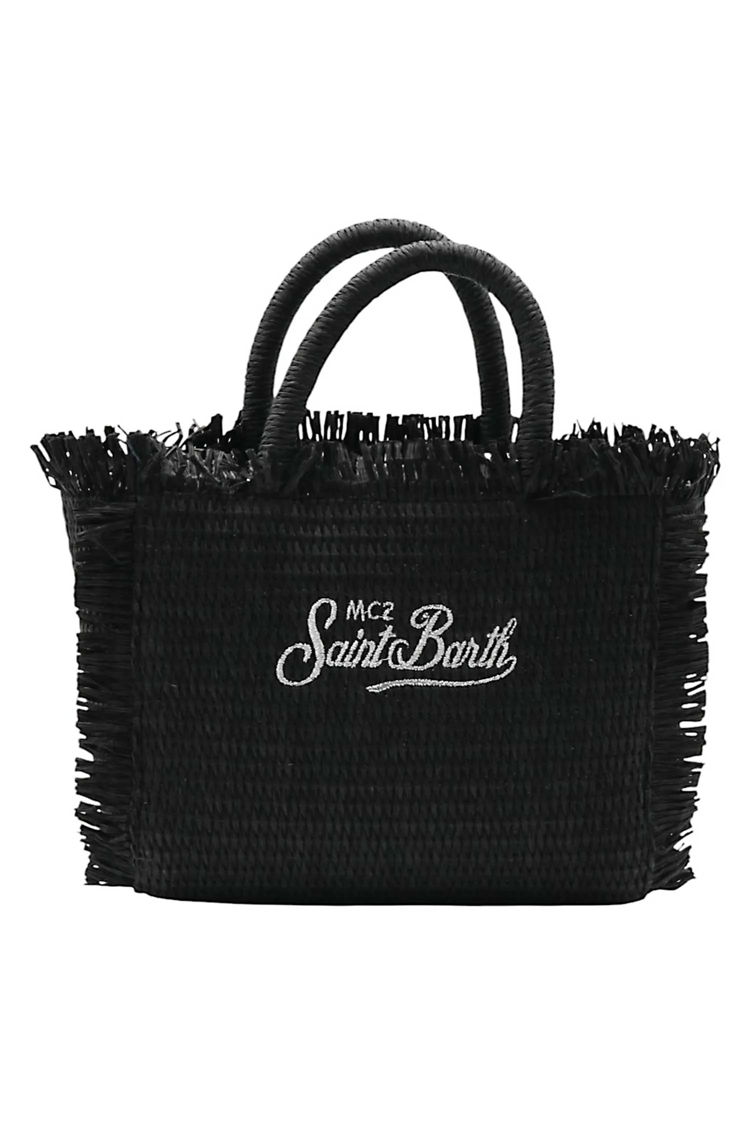 СУМКА VANITY MINI STRAW N ЧЁРНАЯ, ПЛЕТЁНАЯ, ВЫШИТАЯ СЕРЕБРИСТАЯ ЛОГО-НАДПИСЬ, БАХРОМА, РУЧКИ, ПЛЕТЁНЫЙ РЕМЕШОК