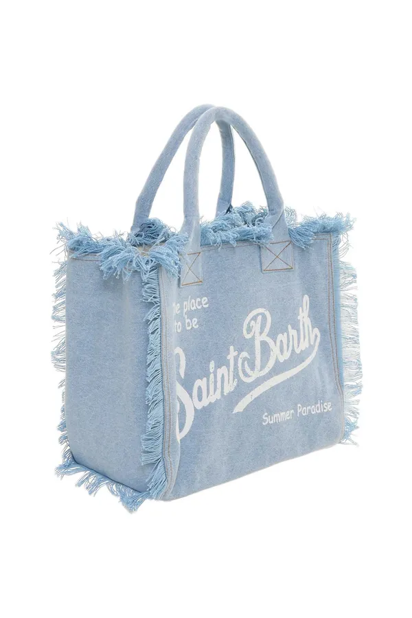 СУМКА VANITY ГОЛУБАЯ, ДЖИНСОВАЯ, БОЛЬШАЯ, БЕЛАЯ ЛОГО-НАДПИСЬ, БАХРОМА