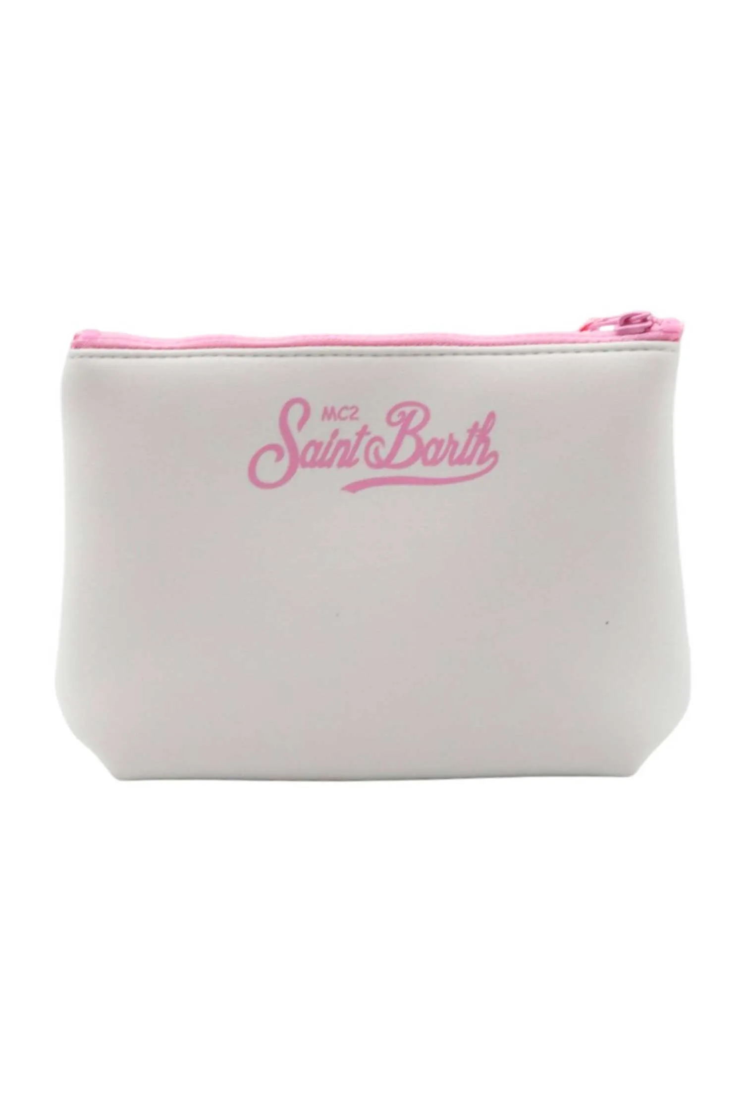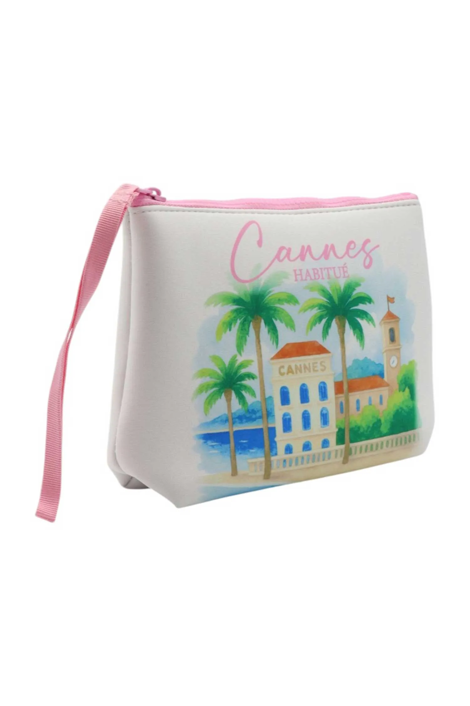 КОСМЕТИЧКА ALINE БЕЛАЯ ИЗ НЕОПРЕНА, РИС.ГОРОД, РОЗОВАЯ НАДПИСЬ CANNES, НА МОЛНИИ, ТЕКСТИЛЬНЫЙ РЕМЕШОК НА РУКУ