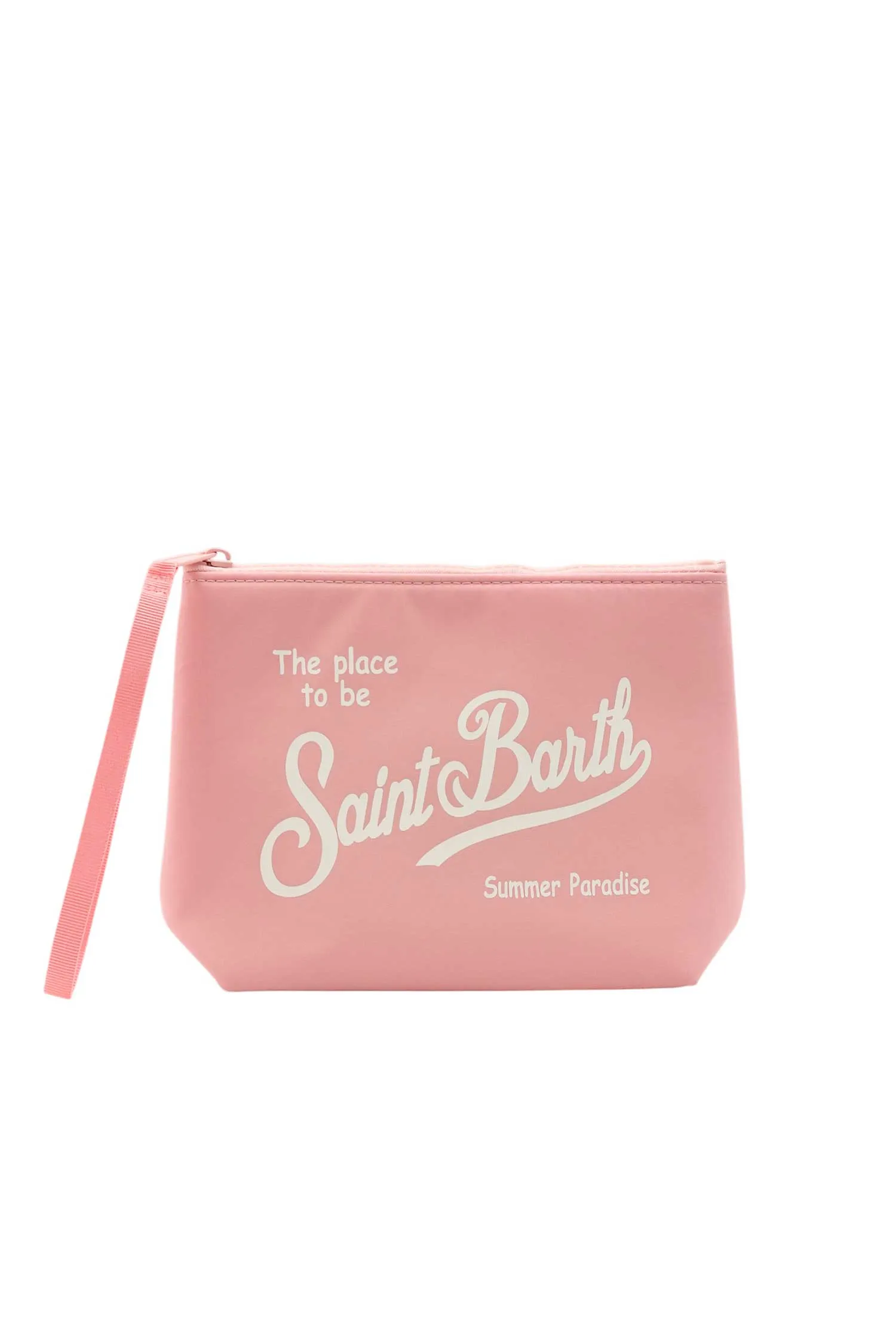 КОСМЕТИЧКА ALINE РОЗОВАЯ ИЗ НЕЙЛОНА, НА МОЛНИИ, БЕЛАЯ ЛОГО-НАДПИСЬ, ТЕКСТИЛЬНЫЙ РЕМЕШОК НА РУКУ