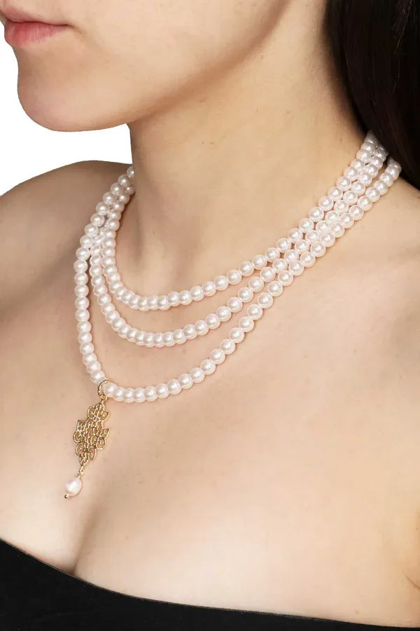 КОЛЬЕ GEM TWIST ИЗ БЕЛОГО ЖЕМЧУГА, МНОГОРЯДНОЕ, АЖУРНАЯ ПОДВЕСКА С БАРОЧНОЙ ЖЕМЧУЖИНОЙ, РЕГУЛИРУЕМЫЙ РАЗМЕР