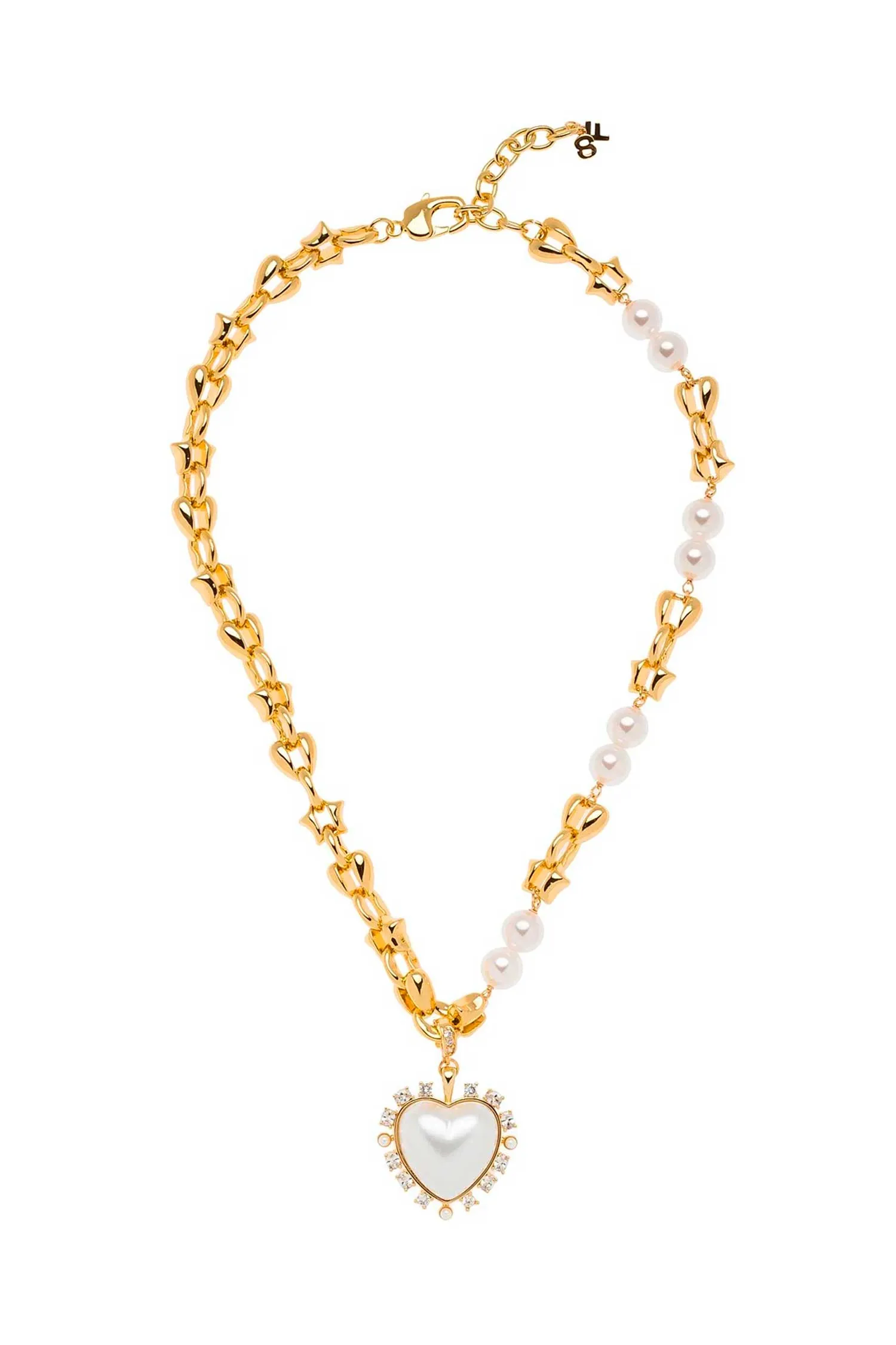 КОЛЬЕ GRAVITY CHARM ЗОЛОТИСТОЕ, ВСТАВКИ ИЗ БЕЛОГО ЖЕМЧУГА, ПОДВЕСКА-СЕРДЦЕ С ФИАНИТАМИ, РЕГУЛИРУЕМЫЙ РАЗМЕР