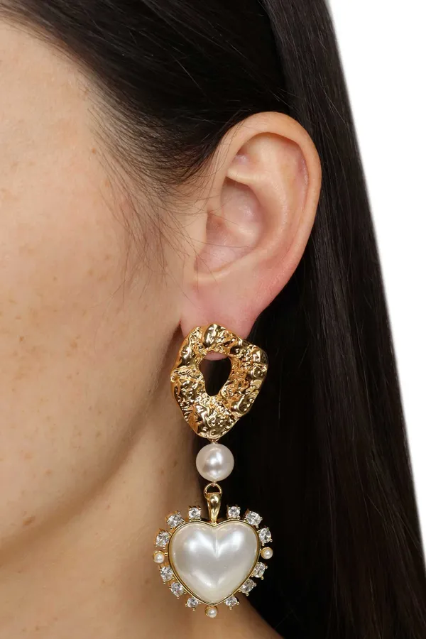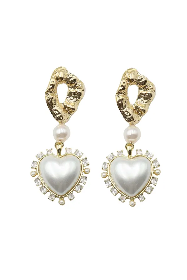 СЕРЬГИ-ГВОЗДИКИ GRAVITY CHARM ЗОЛОТИСТЫЕ, ВСТАВКИ ИЗ БЕЛОГО ЖЕМЧУГА, ПОДВЕСКА-СЕРДЦЕ С ФИАНИТАМИ