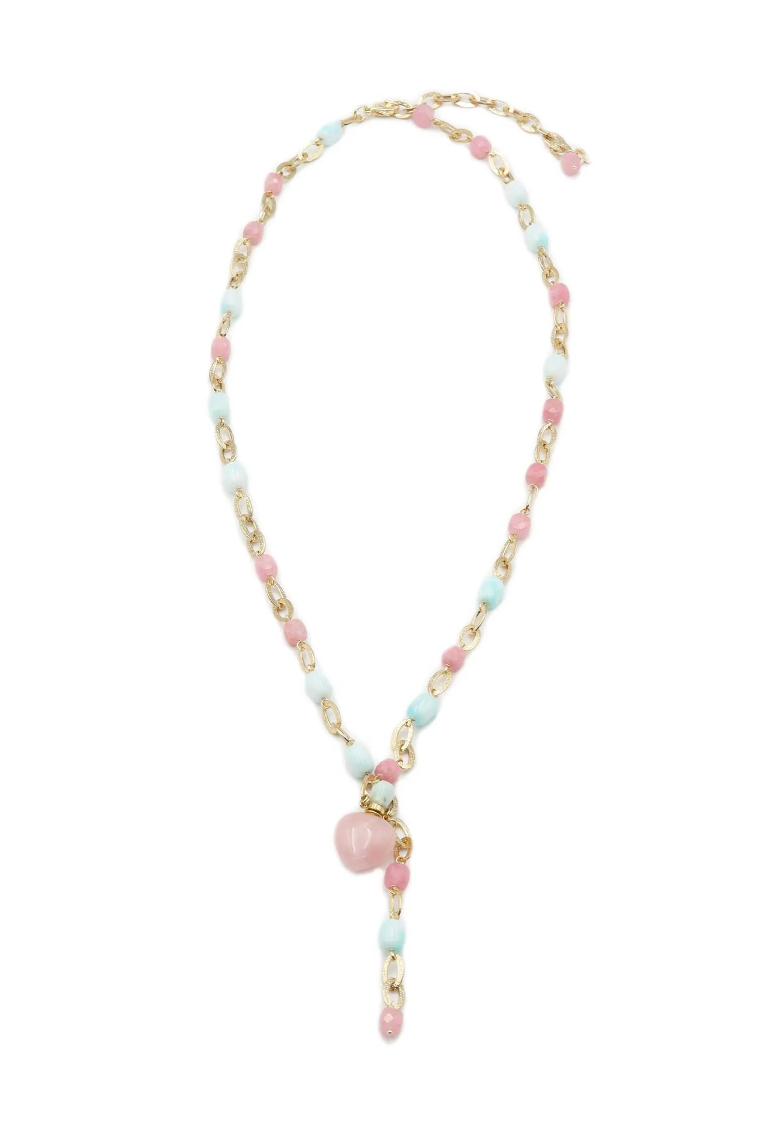 КОЛЬЕ ALCHEMY ЗОЛОТИСТОЕ, ВСТАВКИ ИЗ РОЗОВОГО/ГОЛУБОГО/БЕЛОГО АГАТА, АМАЗОНИТА, КВАРЦА, ВСТАВКА-СЕРДЦЕ, РЕГУЛИРУЕМЫЙ РАЗМЕР