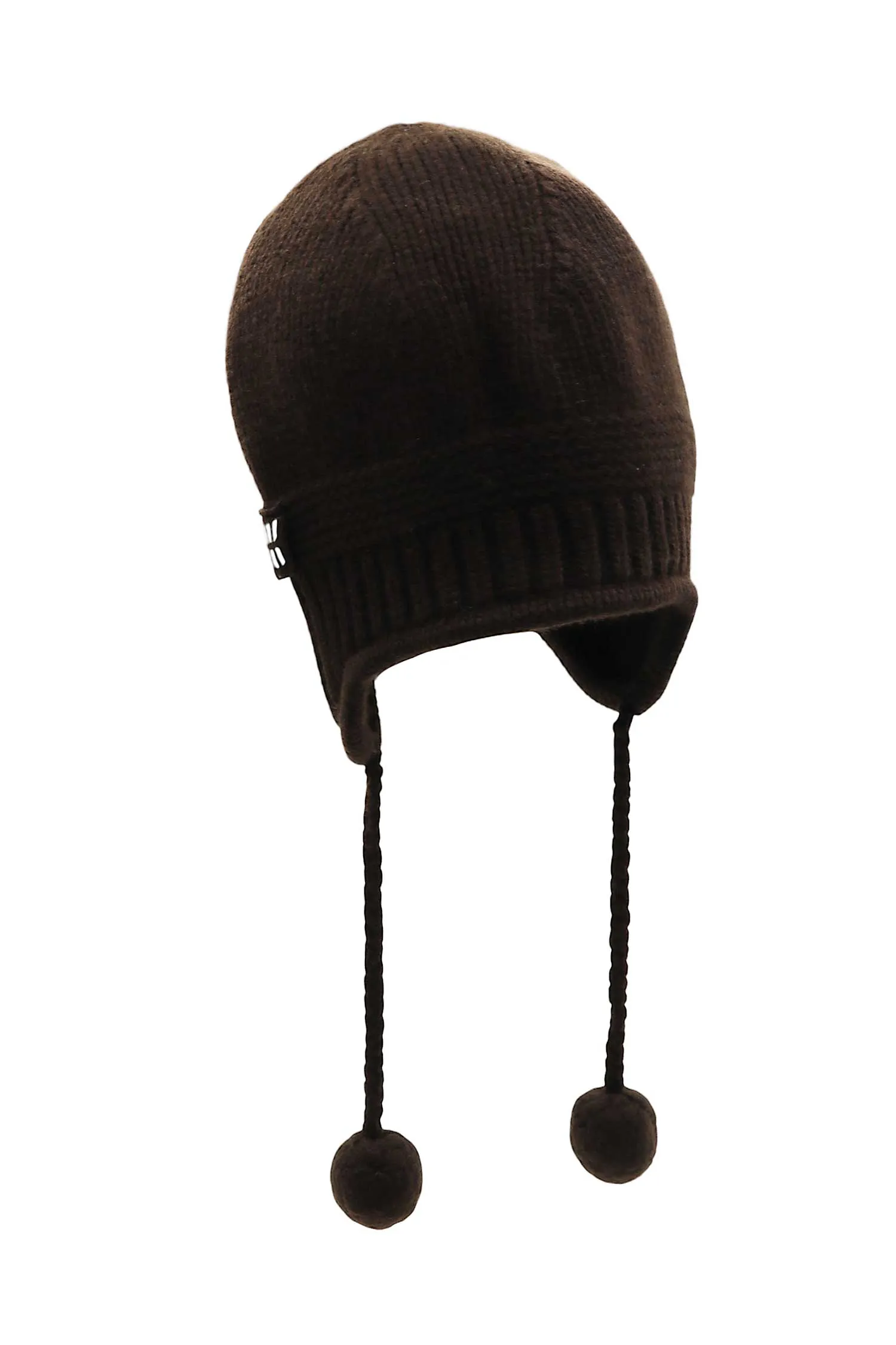 ШАПКА Т/КОРИЧНЕВАЯ ШЕРСТЬ/КАШЕМИР, ЗАВЯЗКИ С ПОМПОНАМИ, СБОКУ НАШИВКА-ЛОГО