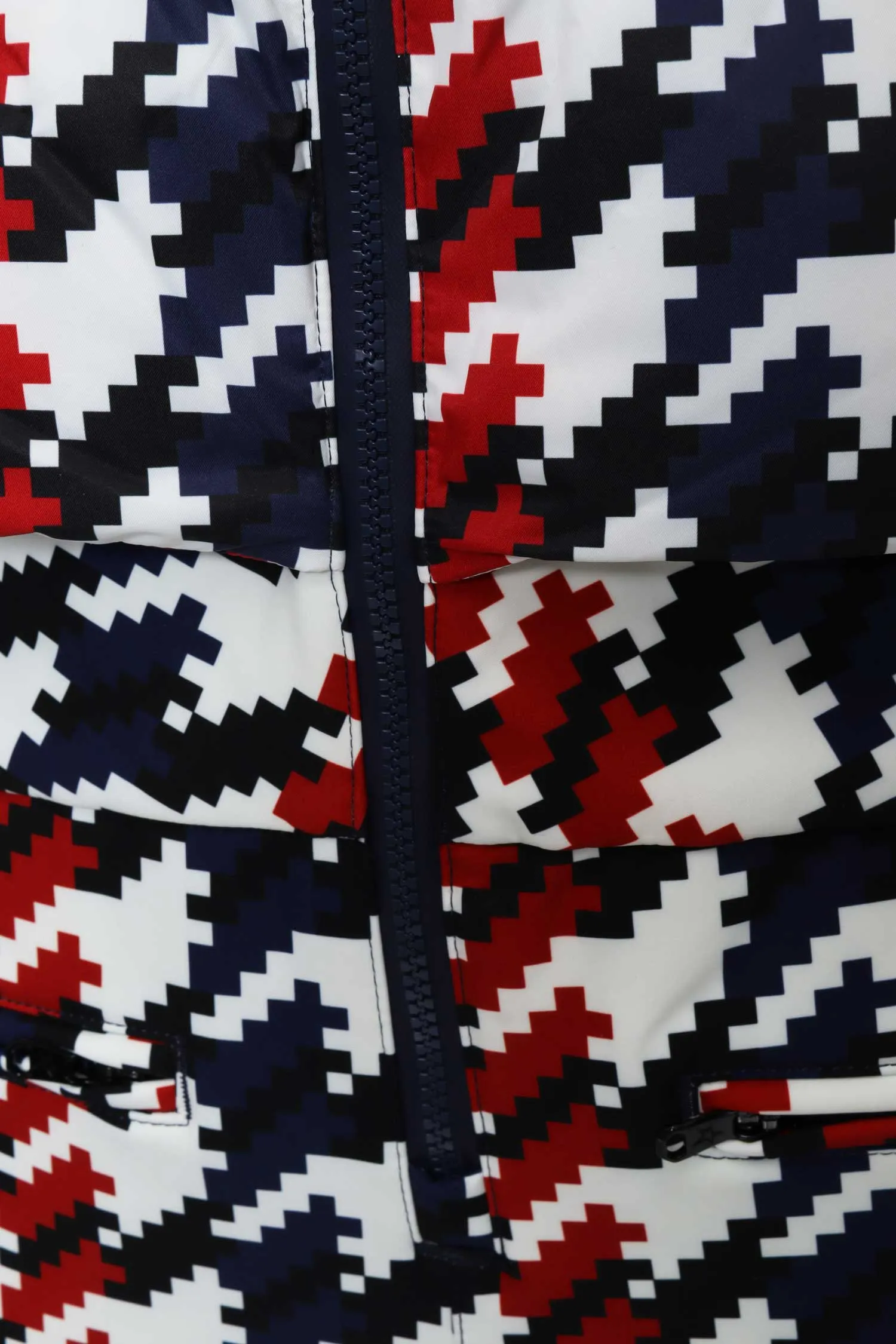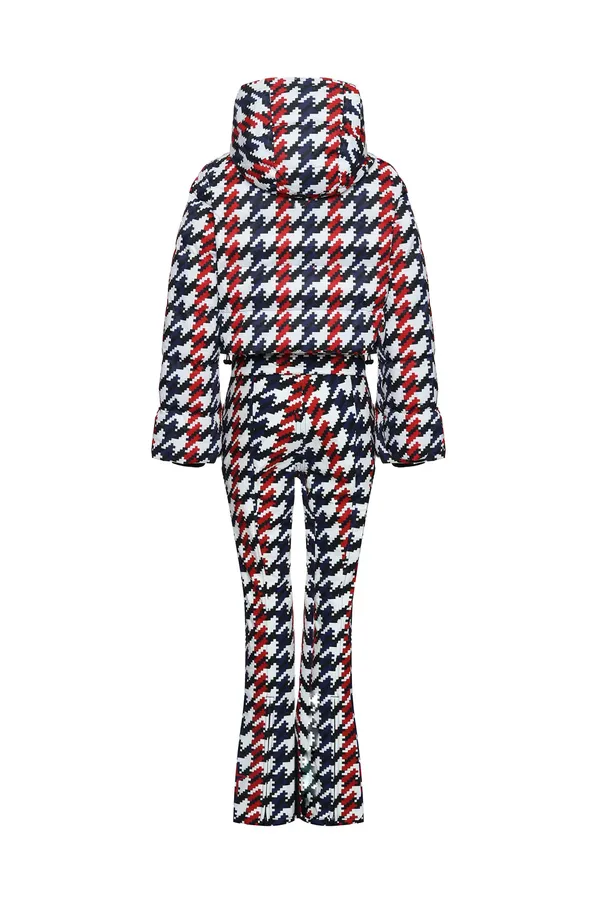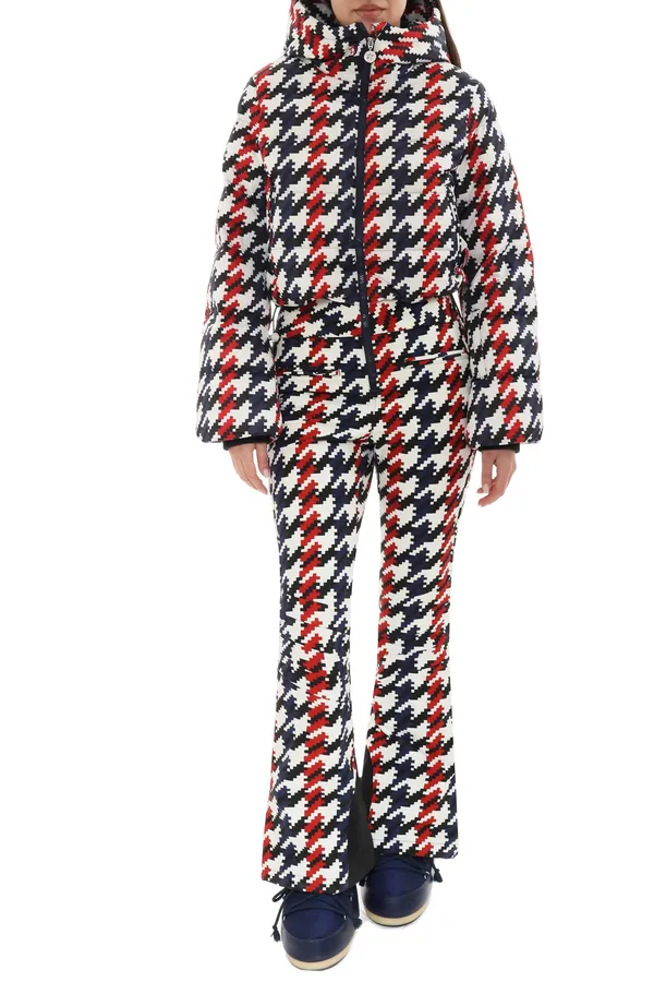 КОМБИНЕЗОН POLAR FLARE СИНЕ-БЕЛО-КРАСНЫЙ, КРУПНЫЙ ПРИНТ ГУСИНАЯ ЛАПКА, НА ПОЯСЕ КУЛИСКА, ТРИКОТАЖ.МАНЖЕТЫ, КАПЮШОН