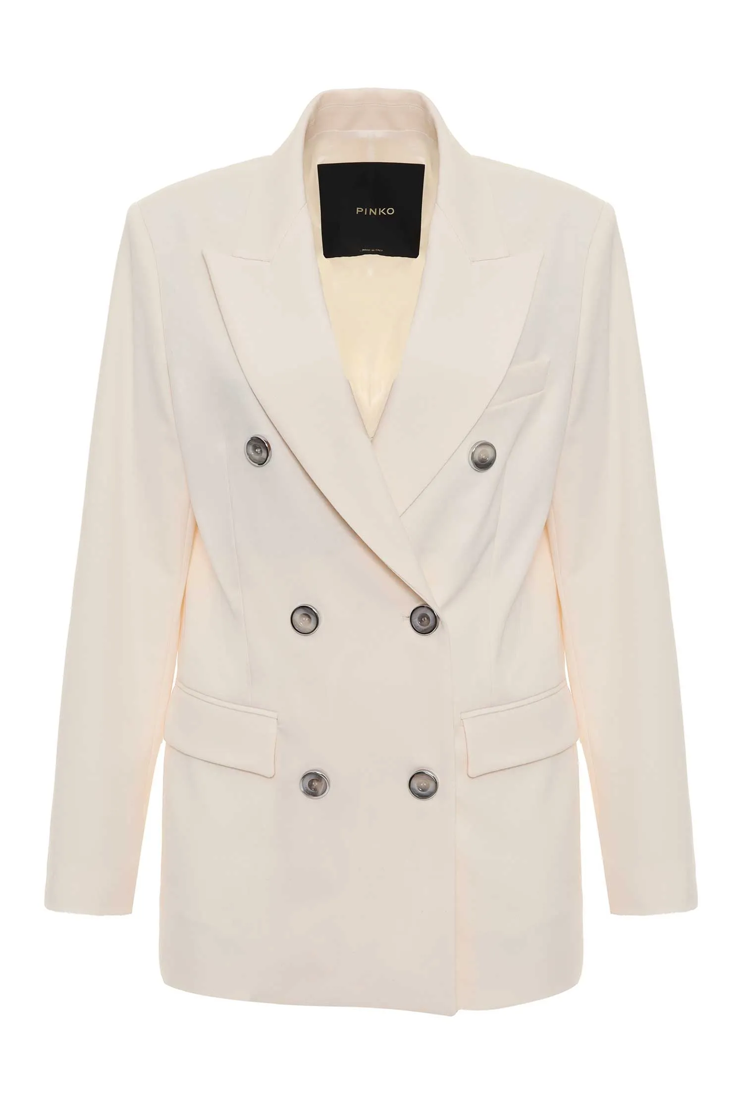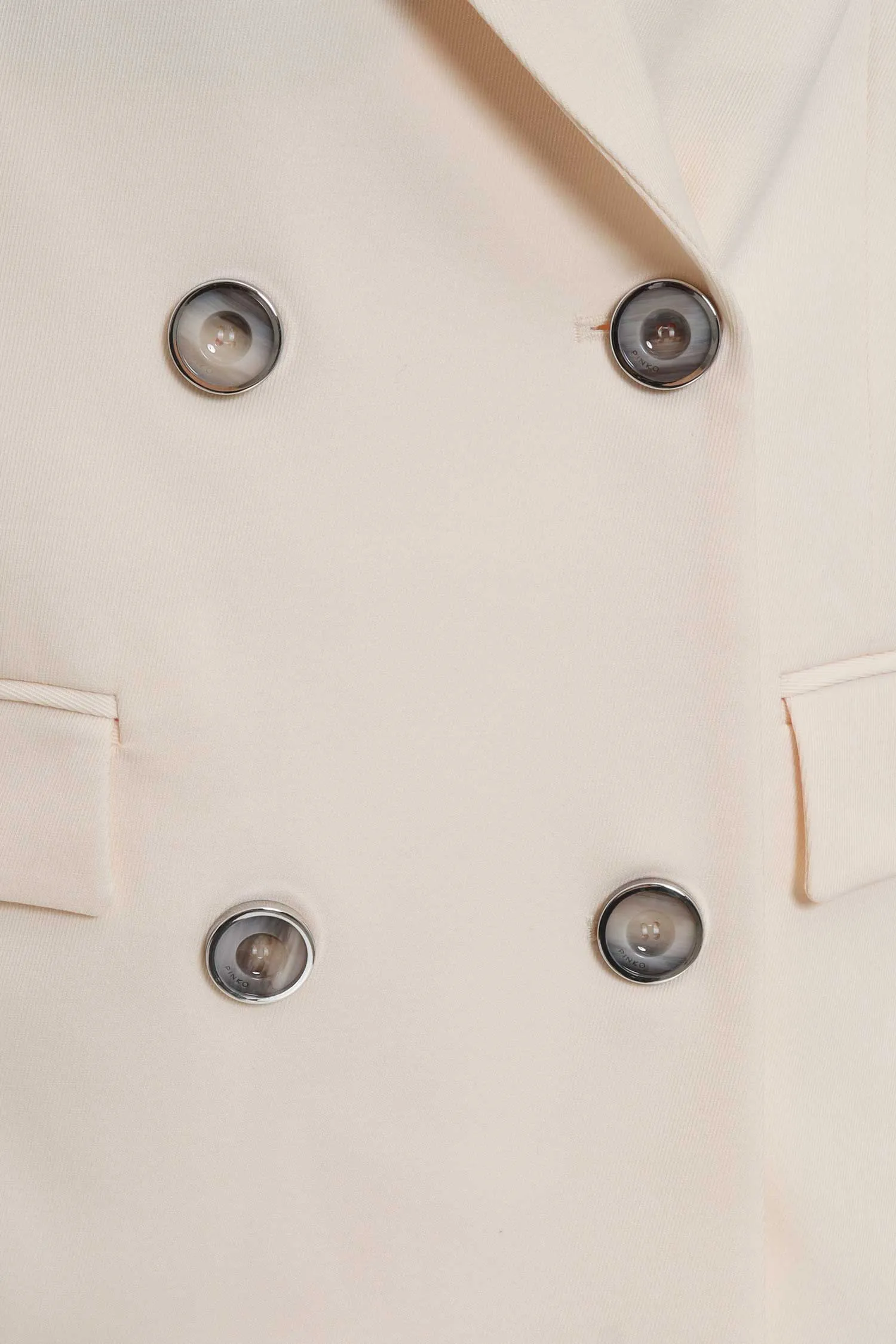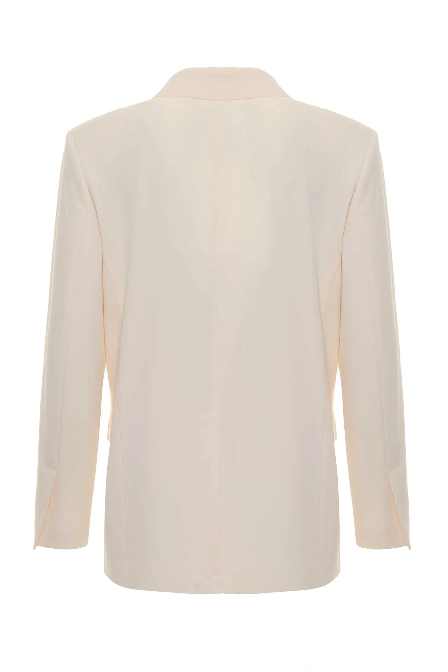ЖАКЕТ МОЛОЧНЫЙ, ДВУБОРТНЫЙ, ПРИТАЛЕННЫЙ, КАРМАНЫ С КЛАПАНОМ, СЗАДИ РАЗРЕЗ