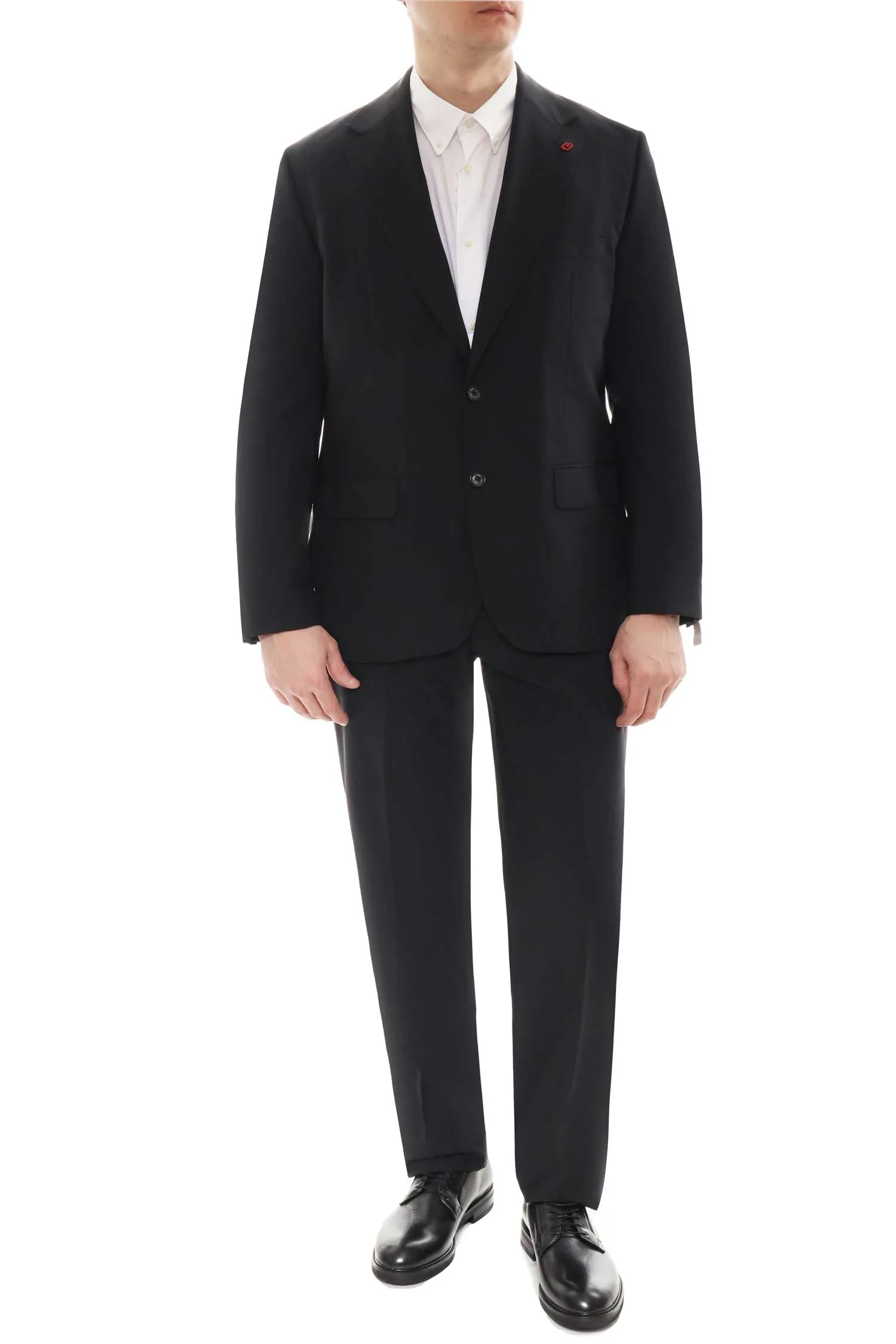 LIU-JO КОСТЮМ M.083 ЧЁРНЫЙ ШЕРСТЬ, ПИДЖАК+БРЮКИ, СЗАДИ РАЗРЕЗЫ, КАРМАНЫ С КЛАПАНОМ, КРАСНОЕ МЕТАЛЛ.ЛОГО НА ЛАЦКАНЕ