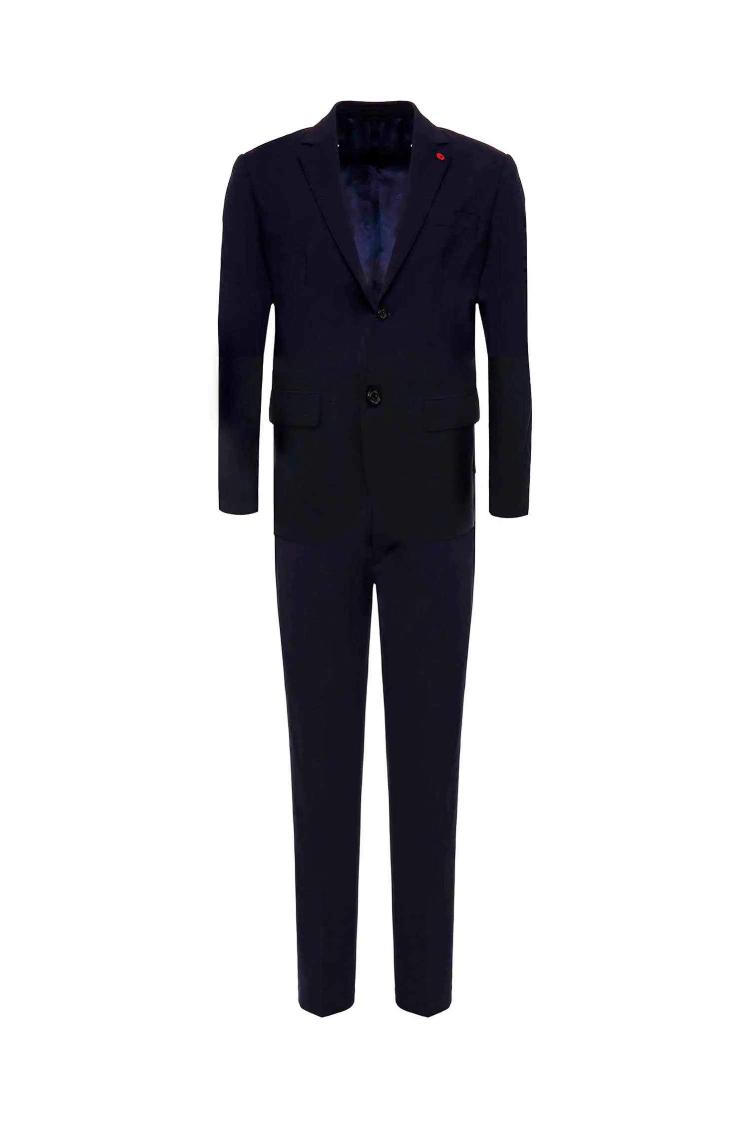 КОСТЮМ M.083 Т/СИНИЙ ШЕРСТЬ, ПИДЖАК+БРЮКИ, СЗАДИ РАЗРЕЗЫ, КАРМАНЫ С КЛАПАНОМ, КРАСНОЕ МЕТАЛЛ.ЛОГО НА ЛАЦКАНЕ