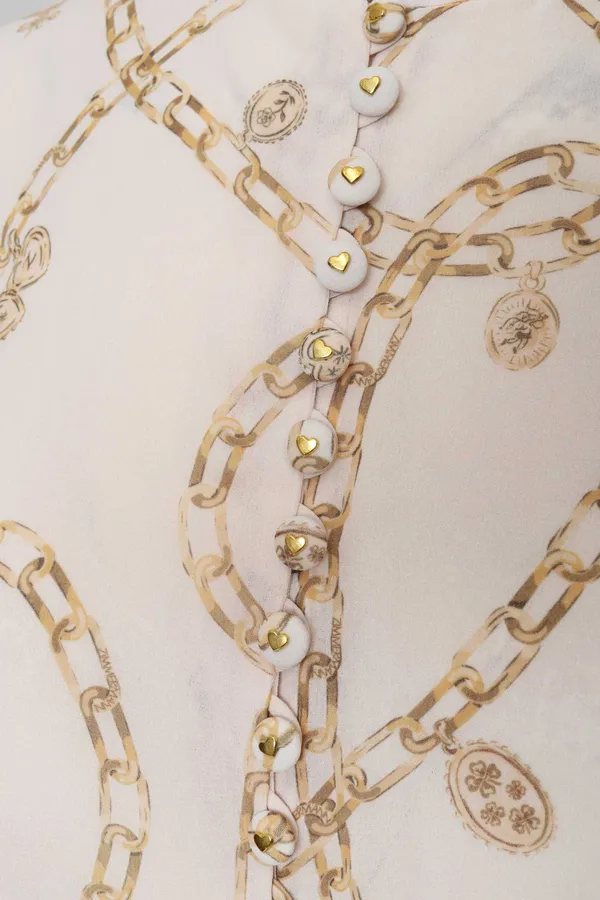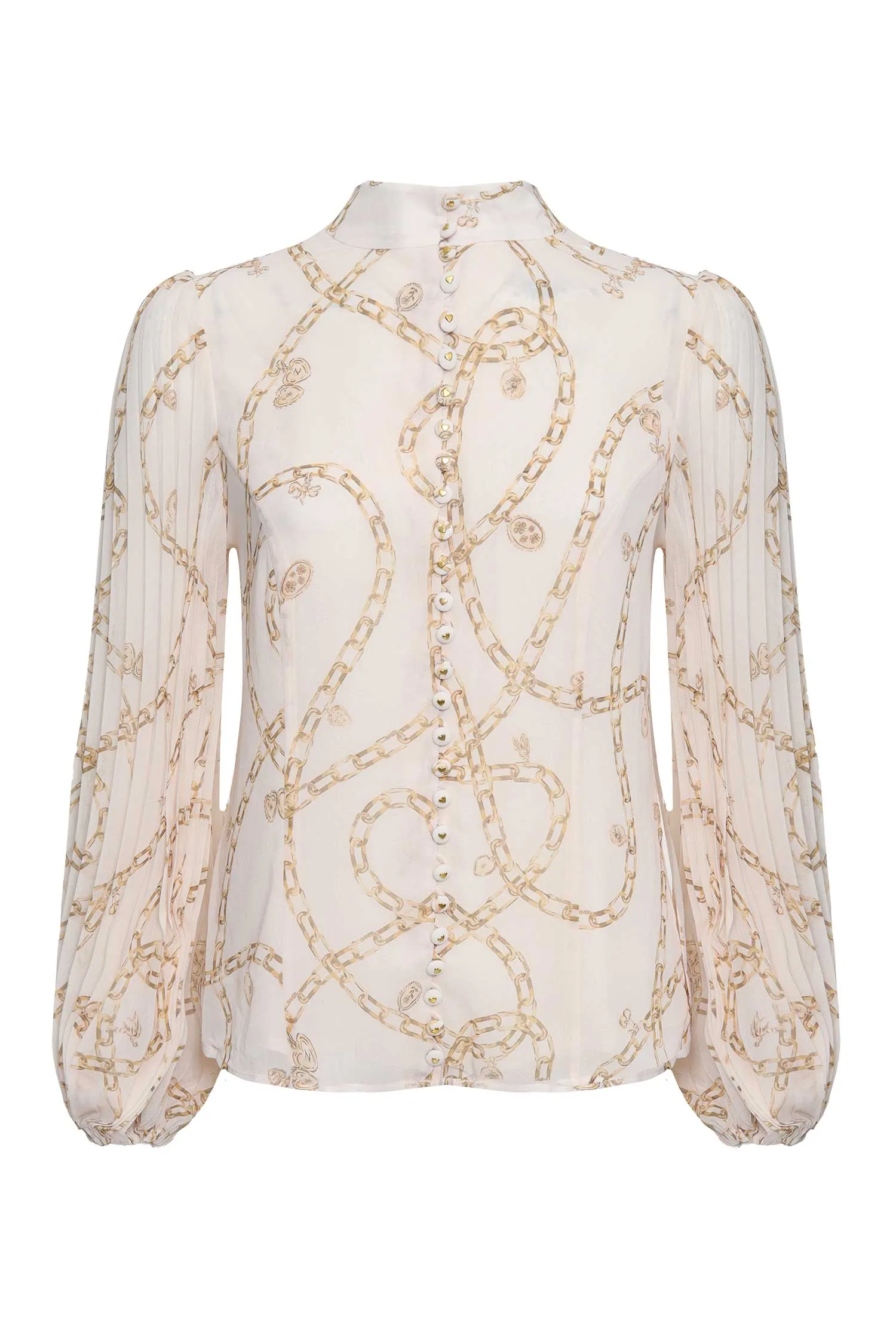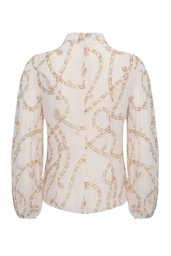 БЛУЗА МОЛОЧНАЯ ИЗ ШИФОНА, БЕЖЕВЫЙ ПРИНТ ЦЕПИ, РУКАВА ПЛИССЕ, ВОРОТ-СТОЙКА