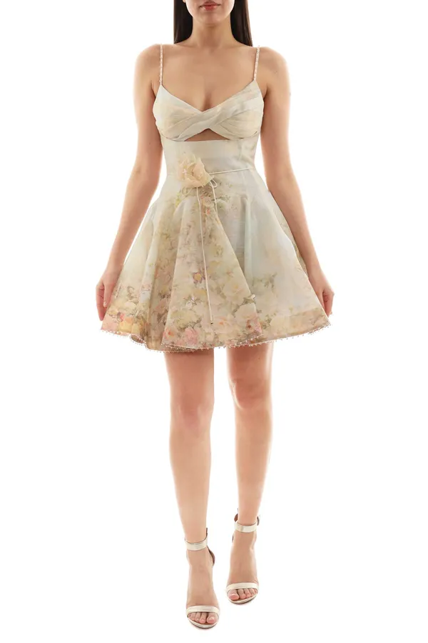 ПЛАТЬЕ МОЛОЧНО-ПУДРОВО-ОЛИВКОВОЕ ЛЁН/ШЁЛК, ПРИНТ РОЗЫ, КОРОТКОЕ, БРЕТЕЛЬКИ И НИЗ ОТД.БУСИНЫ, ПОЯС-ШНУРОК С ЦВЕТКОМ