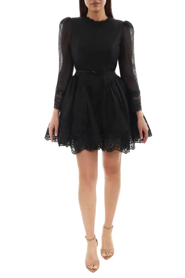 ПЛАТЬЕ ЧЁРНОЕ ЛЁН/ШЁЛК, КОРОТКОЕ, РУКАВА И НИЗ ОТД.КРУЖЕВО В ТОН, ЮБКА-СОЛНЦЕ, ВОРОТ-СТОЙКА, РЕМЕШОК С БАНТИКОМ, ДЛ/РУК.