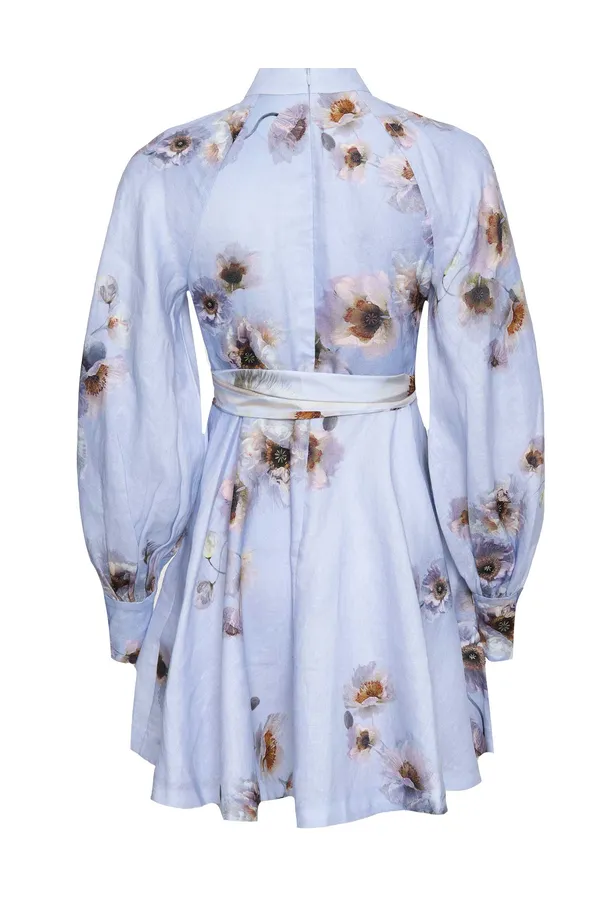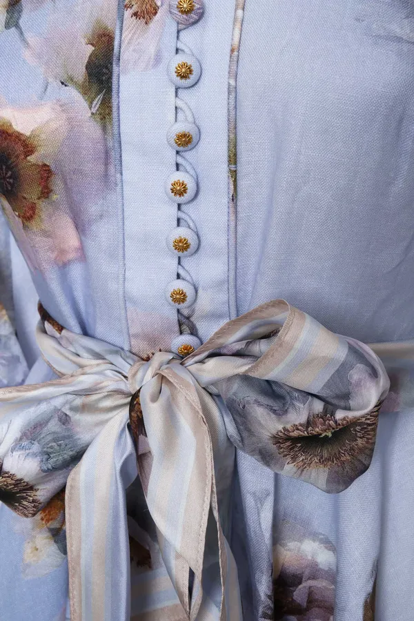 ПЛАТЬЕ-РУБАШКА СИРЕНЕВОЕ ЛЁН, ПРИНТ ЦВЕТЫ, КОРОТКОЕ, ВОРОТ-СТОЙКА, ШЁЛКОВЫЙ ПОЯС, ДЛ/РУК.