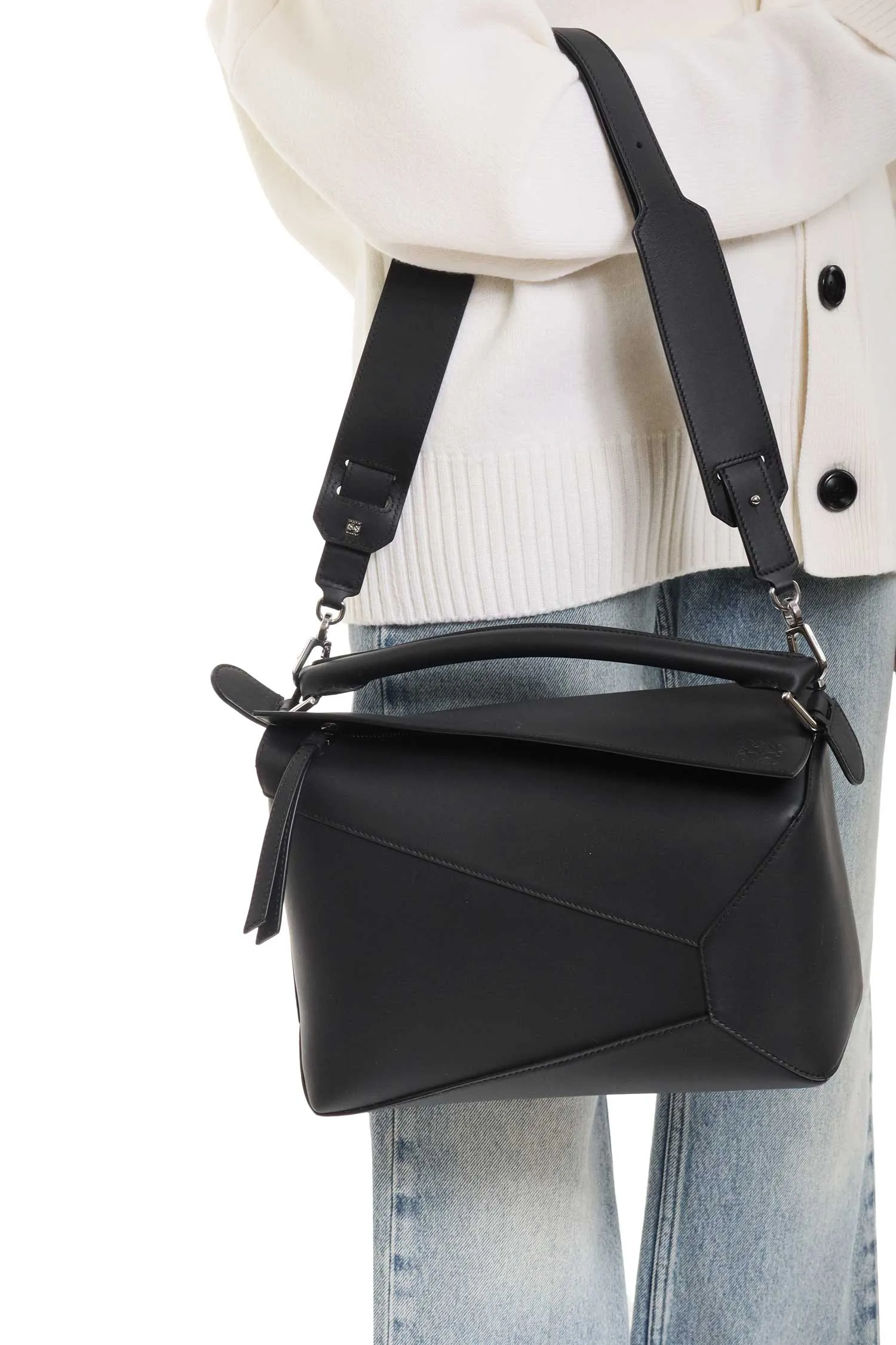 СУМКА PUZZLE EDGE MEDIUM ЧЁРНАЯ, МАТОВАЯ КОЖА, С КЛАПАНОМ, СЗАДИ КАРМАН НА МОЛНИИ, РУЧКА, ОТСТЁГИВАЮЩИЙСЯ РЕМЕНЬ
